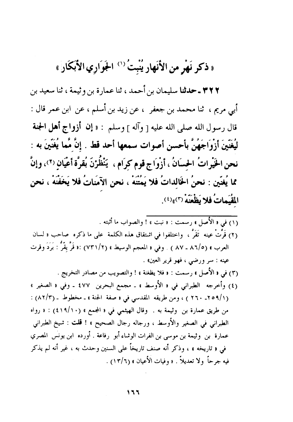 322 - حَدَّثَنَا سُلَيْمَانُ بْنُ أَحْمَدَ، ثنا عُمَارَةُ بْنُ وَثِيمَةَ، ثنا سَعِيدُ بْنُ أَبِي مَرْيَمَ، ثنا مُحَمَّدُ بْنُ جَعْفَرٍ , عَنْ زَيْدِ بْنِ أَسْلَمَ، عَنِ ابْنِ عُمَرَ، قَالَ: قَالَ رَسُولُ اللَّهِ صَلَّى اللَّهُ عَلَيْهِ وَآلِهِ وَسَلَّمَ: إِنَّ §أَزْوَاجَ أَهْلِ الْجَنَّةِ لَيُغَنِّينَ أَزْوَاجَهُنَّ بِأَحْسَنِ أَصْوَاتٍ سَمِعَهَا أَحَدٌ قَطُّ، إِنَّ مِمَّا يُغَنِّينَ بِهِ: نَحْنُ الْخَيْرَاتُ الْحِسَانُ، أَزْوَاجُ قَوْمٍ كِرَامٍ، يَنْظُرْنَ بَقَرَةِ أَعْيَانٍ، وَإِنَّ مِمَّا يُغَنِّينَ: نَحْنُ الْخَالِدَاتُ فَلَا يَمُتْنَهْ، نَحْنُ الْآمِنَاتُ فَلَا يَخَفْنَهْ، نَحْنُ الْمُقِيمَاتُ فَلَا يَظْعَنَّهْ