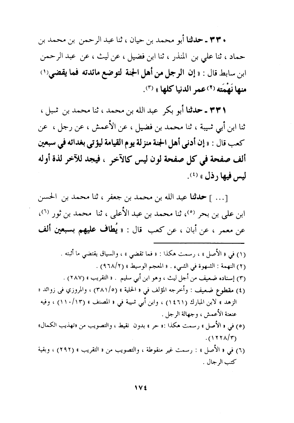 331 - حَدَّثَنَا أَبُو بَكْرٍ عَبْدُ اللَّهِ بْنُ مُحَمَّدٍ، ثنا مُحَمَّدُ بْنُ شِبْلٍ، ثنا ابْنُ أَبِي شَيْبَةَ، ثنا مُحَمَّدُ بْنُ فُضَيْلٍ، عَنِ الْأَعْمَشِ، عَنْ رَجُلٍ , عَنْ كَعْبٍ، قَالَ: إِنَّ §أَدْنَى أَهْلِ الْجَنَّةِ مَنْزِلَةً يَوْمَ الْقِيَامَةِ لَيُؤْتَى بِغِدَائِهِ فِي سَبْعِينَ أَلْفَ صَحْفَةٍ فِي كُلِّ صَحْفَةٍ لَوْنٌ لَيْسَ كَالْآخِرِ، فَيَجِدُ لِلْآخَرِ لَذَّةَ أَوَّلِهِ لَيْسَ فِيهَا رَذْلُ