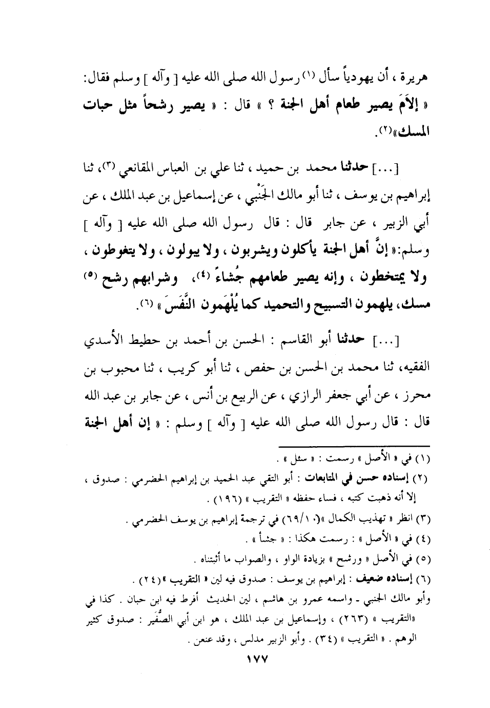 ( ... ) - حَدَّثَنَا مُحَمَّدُ بْنُ حُمَيْدٍ، ثنا عَلِيُّ بْنُ الْعَبَّاسِ الْمَقَانِعِيُّ، ثنا إِبْرَاهِيمُ بْنُ يُوسُفَ، ثنا أَبُو مَالِكٍ الْجُبُنِيُّ، عَنْ إِسْمَاعِيلَ بْنِ عَبْدِ الْمَلِكِ، عَنْ أَبِي الزُّبَيْرِ , عَنْ جَابِرٍ قَالَ: قَالَ رَسُولُ اللَّهِ صَلَّى اللَّهُ عَلَيْهِ وَآلِهِ وَسَلَّمَ: إِنَّ §أَهْلَ الْجَنَّةِ يَأْكُلُونَ وَيَشْرَبُونَ وَلَا يَبُولُونَ، وَلَا يَتَغَوَّطُونَ، وَلَا يَمْتَخِطُونَ، وَإِنَّهُ يَصِيرُ طَعَامُهُمْ جُشَاءً، وَشَرَابُهُمْ رَشْحُ مِسْكٍ، يُلْهَمُونَ التَّسْبِيحَ وَالتَّحْمِيدَ كَمَا يُلْهَمُونَ النَّفْسَ