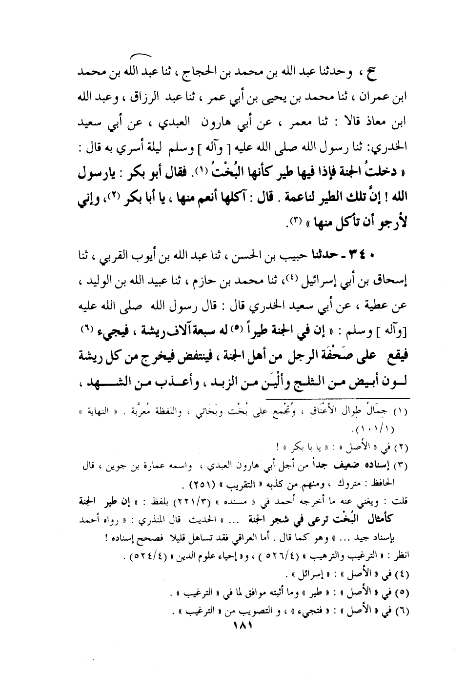 340 - حَدَّثَنَا حَبِيبُ بْنُ الْحَسَنِ، ثنا عَبْدُ اللَّهِ بْنُ أَيُّوبَ الْقِرَبِيُّ، ثنا إِسْحَاقُ بْنُ أَبِي إِسْرَائِيلَ، ثنا مُحَمَّدُ بْنُ خَازِمٍ، ثنا عُبَيْدُ اللَّهِ بْنُ الْوَلِيدِ، عَنْ عَطِيَّةَ , عَنْ أَبِي سَعِيدٍ الْخُدْرِيِّ، قَالَ: قَالَ رَسُولُ اللَّهِ صَلَّى اللَّهُ عَلَيْهِ وَآلِهِ وَسَلَّمَ: إِنَّ §فِي الْجَنَّةِ طَيْرًا لَهُ سَبْعَةُ أَلْفِ رِيشَةٍ، فَيَجِيءُ فَيَقَعُ عَلَى صَحْفَةِ الرَّجُلِ مِنْ أَهْلِ الْجَنَّةِ، فَيَنْتَفِضُ فَيَخْرُجُ مِنْ كُلِّ رِيشَةٍ لَوْنٌ أَبْيَضُ مِنَ الثَّلْجِ وَأَلْيَنُ مِنَ الزَّبَدِ، وَأَعْذَبُ مِنَ الشَّهْدِ، -[182]- لَيْسَ فِيهِ لَوْنٌ يُشْبِهُ صَاحِبَهُ