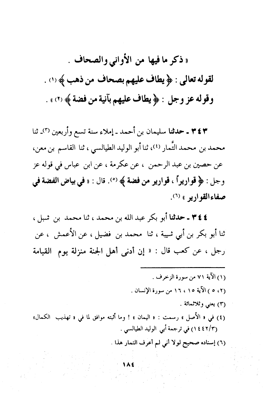 §ذِكْرُ مَا فِيهَا مِنَ الْأَوَانِي وَالصِّحَافِ لِقَوْلِهِ تَعَالَى {يُطَافُ عَلَيْهِمْ بِصِحَافٍ مِنْ ذَهَبٍ} [الزخرف: 71] وَقَوْلِهِ عَزَّ وَجَلَّ {وَيُطَافُ عَلَيْهِمْ بِآنِيَةٍ مِنْ فِضَّةٍ} [الإنسان: 15]