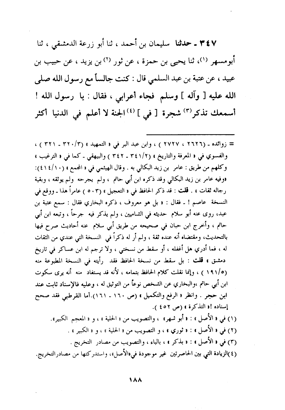 347 - حَدَّثَنَا سُلَيْمَانُ بْنُ أَحْمَدَ، ثنا أَبُو زُرْعَةَ الدِّمَشْقِيُّ، ثنا أَبُو مُسْهَرٍ، ثنا يَحْيَى بْنُ حَمْزَةَ، عَنْ ثَوْرِ بْنِ يَزِيدَ، عَنْ حَبِيبِ بْنِ عُبَيْدٍ , عَنْ عُتْبَةَ بْنِ عَبْدٍ السُّلَمِيِّ، قَالَ: كُنْتُ جَالِسًا مَعَ رَسُولِ اللَّهِ صَلَّى اللَّهُ عَلَيْهِ وَآلِهِ وَسَلَّمَ فَجَاءَ أَعْرَابِيٌّ فَقَالَ: يَا رَسُولَ اللَّهِ، أَسْمَعُكَ تَذْكُرُ شَجَرَةً فِي الْجَنَّةِ لَا أَعْلَمُ فِي الدُّنْيَا أَكْثَرَ -[189]- شَوْكًا مِنْهَا، يَعْنِي الطَّلْحَ، فَقَالَ رَسُولُ اللَّهِ صَلَّى اللَّهُ عَلَيْهِ وَآلِهِ وَسَلَّمَ:، §يَجْعَلُ مَكَانَ كُلِّ شَوْكَةٍ مِثْلَ خُصْوَةِ التَّيْسِ الْمَلْبُودِ، يَعْنِي الْخَصِيَّ، فِيهَا سَبْعُونَ لَوْنًا مِنَ الطَّعَامِ لَا يُشْبِهُ لَوْنٌ لَوْنَ الْآخَرِ