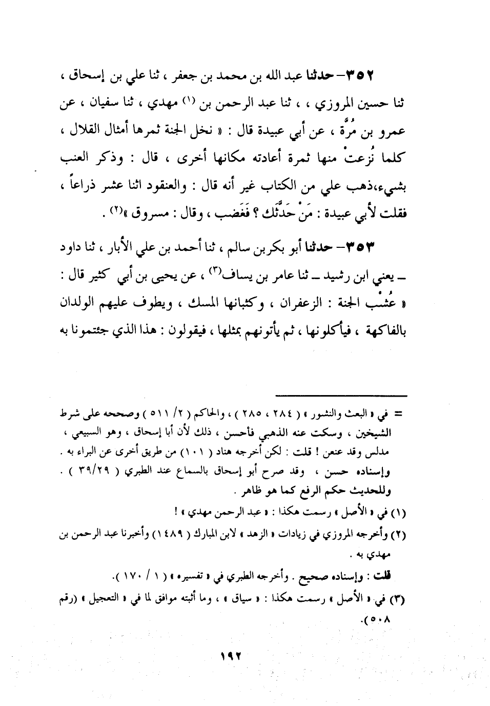 352 - حَدَّثَنَا عَبْدُ اللَّهِ بْنُ مُحَمَّدِ بْنِ جَعْفَرٍ، ثنا عَلِيُّ بْنُ إِسْحَاقَ، ثنا حُسَيْنُ الْمَرْوَزِيُّ، ثنا عَبْدُ الرَّحْمَنِ بْنُ مَهْدِيٍّ، ثنا سُفْيَانُ، عَنْ عَمْرِو بْنِ مُرَّةَ , عَنْ أَبِي عُبَيْدَةَ، قَالَ: " §نَخْلُ الْجَنَّةِ ثَمَرُهَا أَمْثَالُ الْقِلَالِ، كُلَّمَا نُزِعَتْ مِنْهَا ثَمَرَةٌ أَعَادَتْهُ مَكَانَهَا أُخْرَى، قَالَ: وَذَكَرَ الْعِنَبَ بِشَيْءٍ، ذَهَبَ عَلَيَّ مِنَ الْكِتَابِ غَيْرَ أَنَّهُ قَالَ: وَالْعُنْقُودُ اثْنَا عَشَرَ ذِرَاعًا، فَقُلْتُ لِأَبِي عُبَيْدَةَ: مَنْ حَدَّثَكَ؟ فَغَضِبَ وَقَالَ: مَسْرُوقٌ
