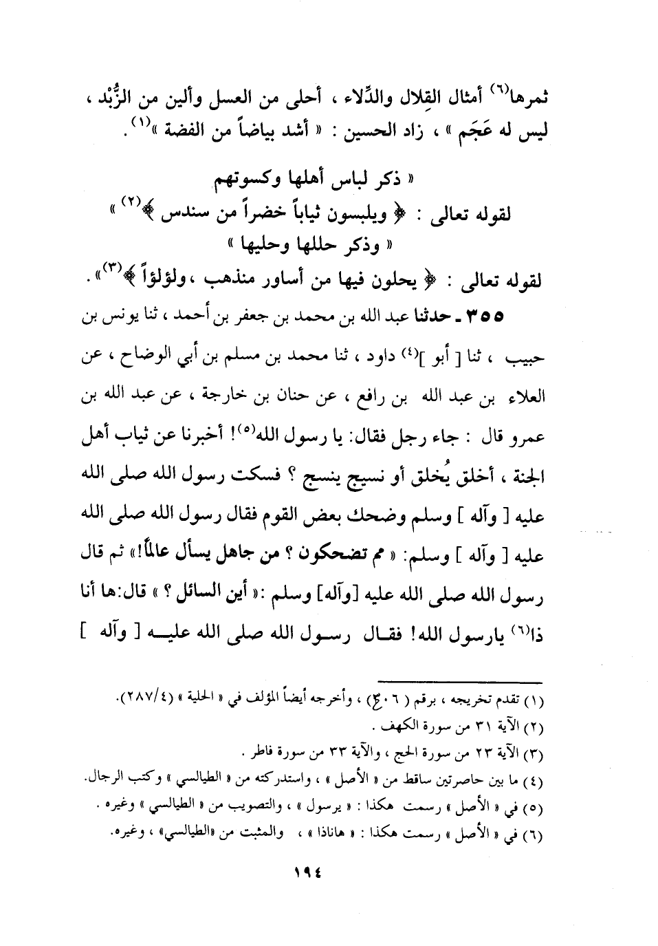 355 - حَدَّثَنَا عَبْدُ اللَّهِ بْنُ مُحَمَّدِ بْنِ جَعْفَرِ بْنِ أَحْمَدَ، ثنا يُونُسُ بْنُ حَبِيبٍ، ثنا أَبُو دَاوُدَ، ثنا مُحَمَّدُ بْنُ مُسْلِمِ بْنِ أَبِي الْوَضَّاحِ، عَنِ الْعَلَاءِ بْنِ عَبْدِ اللَّهِ بْنِ رَافِعٍ، عَنْ حَنَانِ بْنِ خَارِجَةَ , عَنْ عَبْدِ اللَّهِ بْنِ عَمْرٍو، قَالَ: جَاءُ رَجُلٌ فَقَالَ: يَا رَسُولَ اللَّهِ، أَخْبِرْنَا عَنْ ثِيَابِ أَهْلِ الْجَنَّةِ، أُخْلَقٌ يُخْلَقُ أَوْ نَسِيجٌ يُنْسَجُ؟ فَسَكَتَ رَسُولُ اللَّهِ صَلَّى اللَّهُ عَلَيْهِ وَآلِهِ وَسَلَّمَ وَضَحِكَ بَعْضُ الْقَوْمِ فَقَالَ رَسُولُ اللَّهِ صَلَّى اللَّهُ عَلَيْهِ وَآلِهِ وَسَلَّمَ:، مِمَّ تَضْحَكُونَ؟ مِنْ جَاهِلٍ يَسْأَلُ عَالِمًا؟، ثُمَّ قَالَ رَسُولُ اللَّهِ صَلَّى اللَّهُ عَلَيْهِ وَآلِهِ وَسَلَّمَ: أَيْنَ السَّائِلُ، قَالَ: هَا أَنَا ذَا يَا رَسُولَ اللَّهِ. فَقَالَ رَسُولُ اللَّهِ صَلَّى اللَّهُ عَلَيْهِ وَآلِهِ -[195]- وَسَلَّمَ: بَلْ §تَشَقَّقَ عَنْهَا ثَمَرُ الْجَنَّةِ، قَالَهَا مَرَّتَيْنِ وَعَنْ مُجَالِدٍ , عَنِ الشَّعْبِيِّ، عَنْ جَابِرٍ