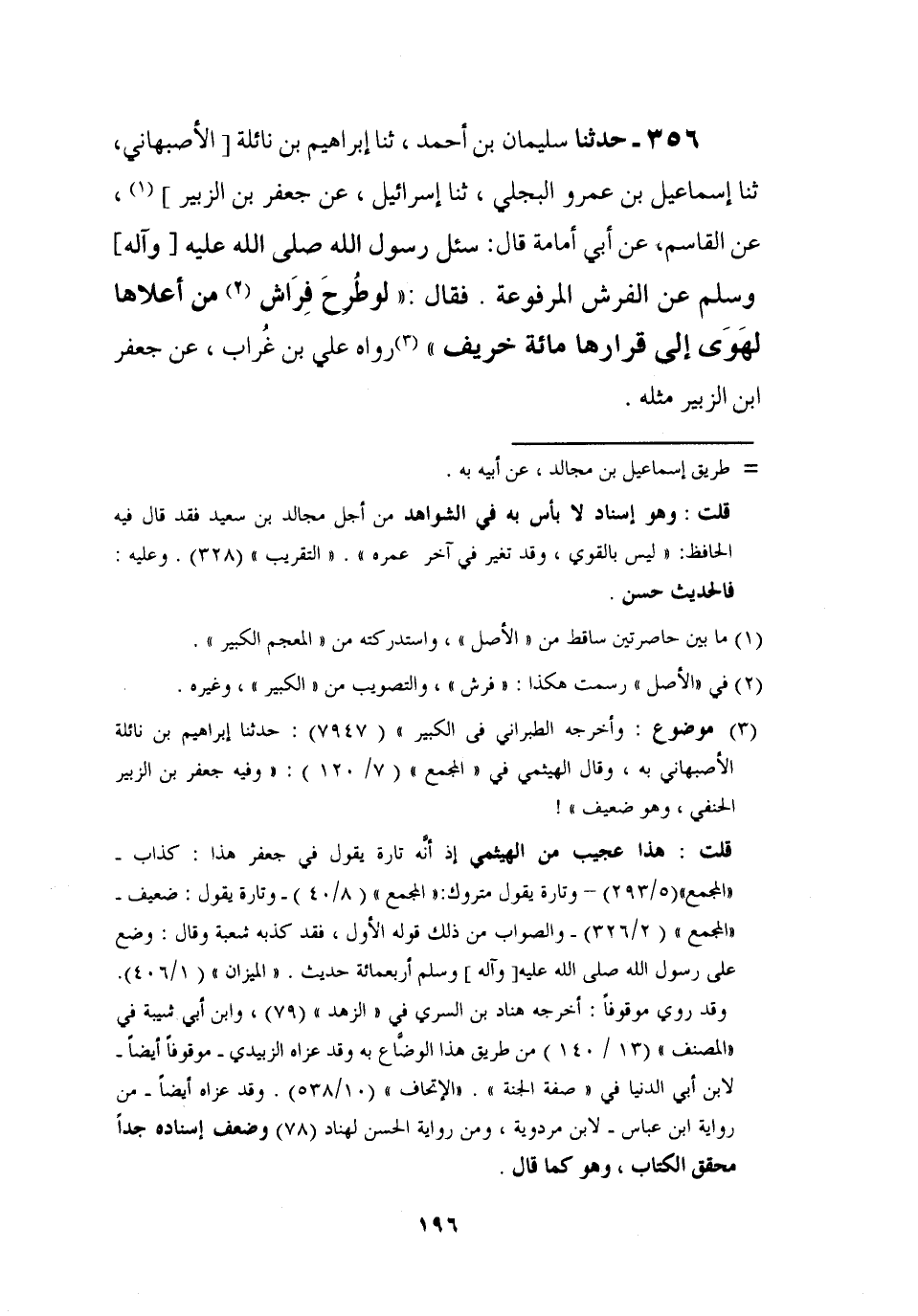 356 - حَدَّثَنَا سُلَيْمَانُ بْنُ أَحْمَدَ، ثنا إِبْرَاهِيمُ بْنُ نَائِلَةَ الْأَصْبَهَانِيُّ، ثنا إِسْمَاعِيلُ بْنُ عَمْرٍو الْبَجَلِيُّ، ثنا إِسْرَائِيلُ، عَنْ جَعْفَرِ بْنِ الزُّبَيْرِ، عَنِ الْقَاسِمِ , عَنْ أَبِي أُمَامَةَ، قَالَ: سُئِلَ رَسُولُ اللَّهِ صَلَّى اللَّهُ عَلَيْهِ وَآلِهِ وَسَلَّمَ عَنِ الْفُرُشِ الْمَرْفُوعَةِ فَقَالَ: §" لَوْ طُرِحَ فِرَاشٌ مِنْ أَعْلَاهَا لَهَوَى إِلَى قَرَارِهَا مِائَةَ خَرِيفٍ رَوَاهُ عَلِيُّ بْنُ غُرَابٍ، عَنْ جَعْفَرِ بْنِ الزُّبَيْرِ مِثْلَهُ