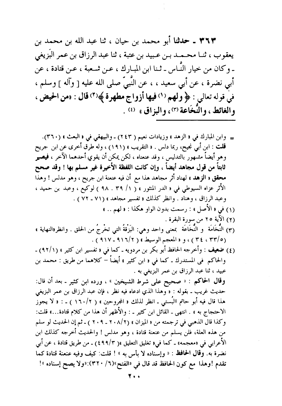 363 - حَدَّثَنَا أَبُو مُحَمَّدِ بْنُ حَيَّانَ، ثنا عَبْدُ اللَّهِ بْنُ مُحَمَّدِ بْنِ يَعْقُوبَ، ثنا مُحَمَّدُ بْنُ عُبَيْدِ بْنِ عُتْبَةَ، ثنا عَبْدُ الرَّزَّاقِ بْنُ عُمَرَ الْبَزِيغِيُّ وَكَانَ مِنْ خِيَارِ النَّاسِ، ثنا ابْنُ الْمُبَارَكِ، عَنْ شُعْبَةَ، عَنْ قَتَادَةَ، عَنْ أَبِي نَضْرَةَ , عَنْ أَبِي سَعِيدٍ، عَنِ النَّبِيِّ صَلَّى اللَّهُ عَلَيْهِ وَآلِهِ وَسَلَّمَ، فِي قَوْلِهِ تَعَالَى {لَهُمْ فِيهَا أَزْوَاجٌ مُطَهَّرَةٌ} [النساء: 57] قَالَ: " §مِنَ الْحَيْضِ وَالْغَائِطِ وَالنُّخَامَةِ، وَالْبُزَاقِ