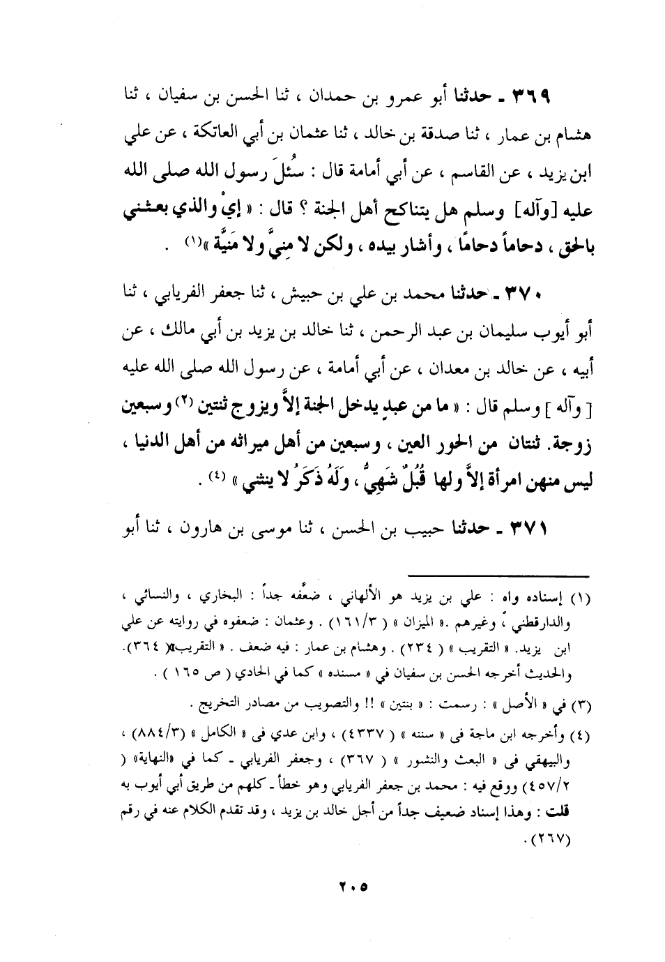 370 - حَدَّثَنَا مُحَمَّدُ بْنُ عَلِيِّ بْنِ حُبَيْشٍ، ثنا جَعْفَرٌ الْفِرْيَابِيُّ، ثنا أَبُو أَيُّوبَ سُلَيْمَانُ بْنُ عَبْدِ الرَّحْمَنِ، ثنا خَالِدُ بْنُ يَزِيدَ بْنِ أَبِي مَالِكٍ، عَنْ أَبِيهِ، عَنْ خَالِدِ بْنِ مَعْدَانَ , عَنْ أَبِي أُمَامَةَ، عَنْ رَسُولِ اللَّهِ صَلَّى اللَّهُ عَلَيْهِ وَآلِهِ وَسَلَّمَ قَالَ: §" مَا مِنْ عَبْدٍ يَدْخُلُ الْجَنَّةَ إِلَّا وَيُزَوَّجُ ثِنْتَيْنِ وَسَبْعِينَ زَوْجَةً ثِنْتَانِ مِنَ الْحُورِ الْعِينِ، وَسَبْعِينَ مِنْ أَهْلِ مِيرَاثِهِ مِنَ أَهْلِ الدُّنْيَا، لَيْسَ مِنْهُنَّ امْرَأَةٌ إِلَّا وَلَهَا قُبُلٌ شَهِيُّ وَلَهُ ذَكَرٌ لَا يَنْثَنِي