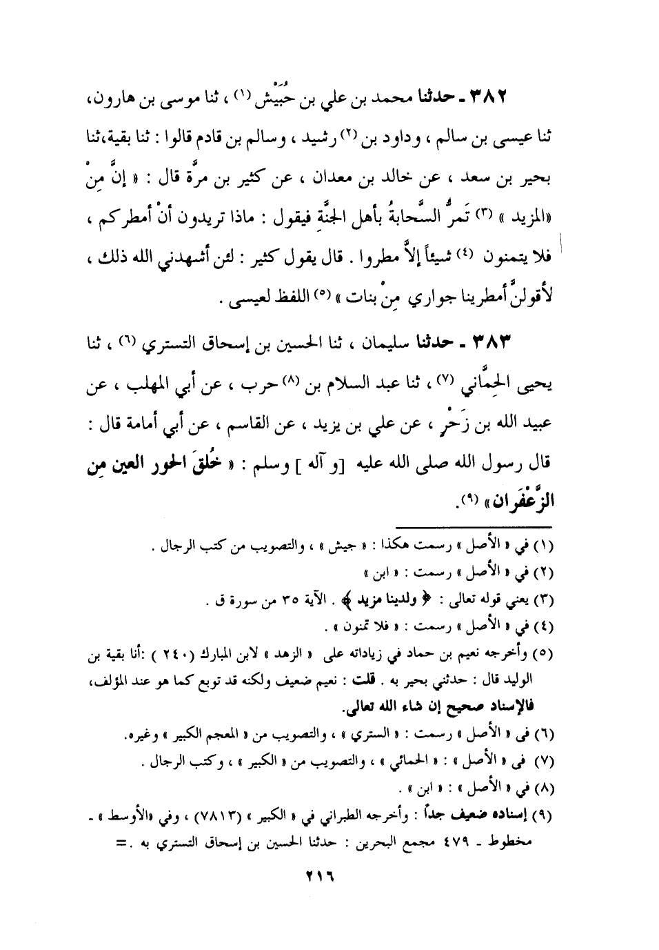 382 - حَدَّثَنَا مُحَمَّدُ بْنُ عَلِيِّ بْنِ حُبَيْشٍ، ثنا مُوسَى بْنُ هَارُونَ، ثنا عِيسَى بْنُ سَالِمٍ، وَدَاوُدُ بْنُ رُشَيْدٍ، وَسَالِمُ بْنُ قَادِمٍ، قَالُوا: ثنا بَقِيَّةُ، ثنا بَحِيرُ بْنُ سَعْدٍ، عَنْ خَالِدِ بْنِ مَعْدَانَ , عَنْ كَثِيرِ بْنِ مُرَّةَ، قَالَ: إِنَّ §مِنَ الْمَزِيدِ، تَمُرُّ السَّحَابَةُ بِأَهْلِ الْجَنَّةِ فَتَقُولُ: مَاذَا تُرِيدُونَ أَنْ أُمْطِرَكُمْ؟ فَلَا يَتَمَنَّوْنَ شَيْئًا إِلَّا مُطِرُوا. قَالَ: يَقُولُ كَثِيرٌ: لَئِنْ أَشْهَدَنِي اللَّهُ ذَلِكَ، لَأَقُولَنَّ لَهَا أَمْطِرِينَا جَوَارِيَ مِنْ بَنَاتٍ اللَّفْظُ لِعِيسَى