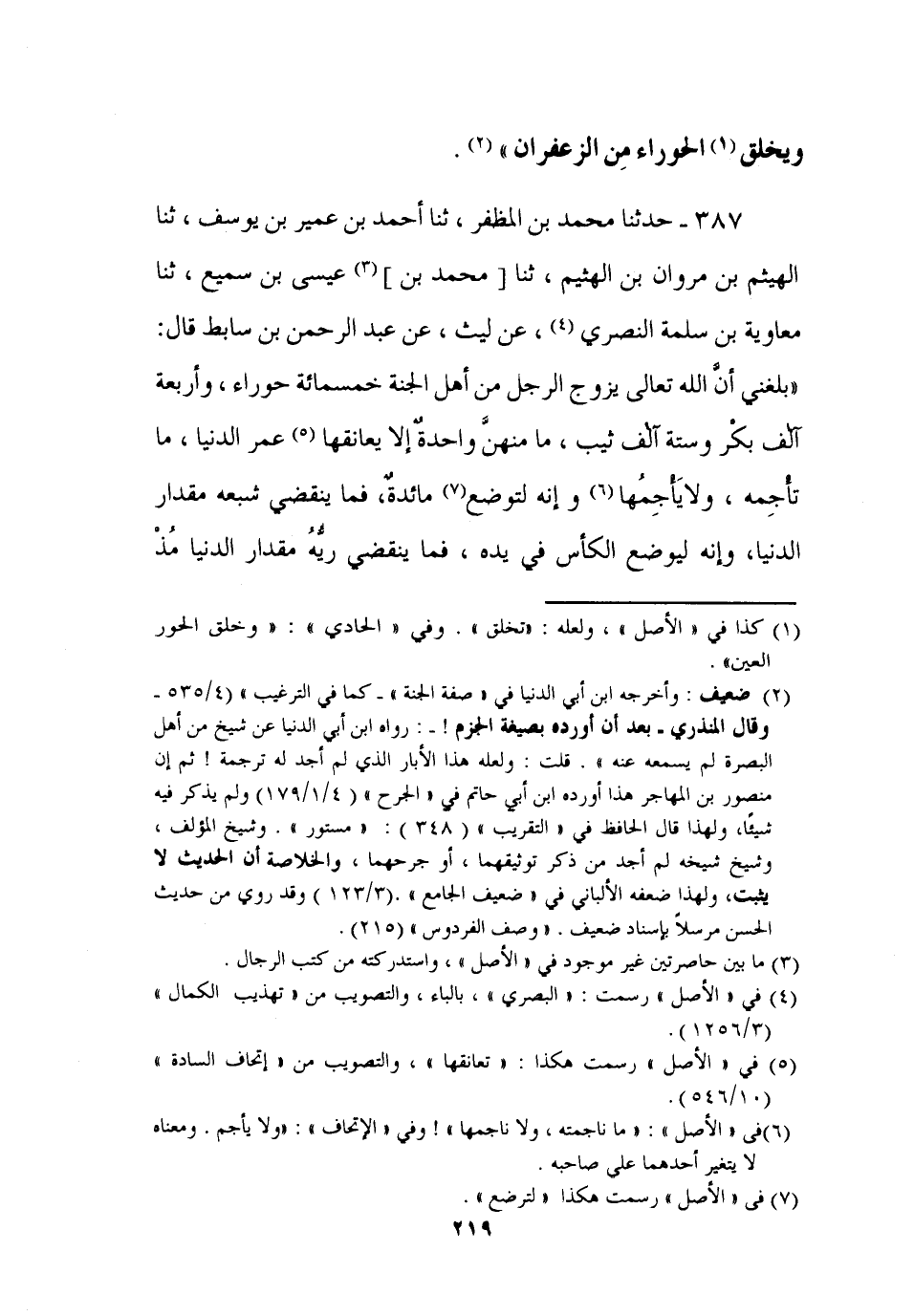 387 - حَدَّثَنَا مُحَمَّدُ بْنُ الْمُظَفَّرِ، ثنا أَحْمَدُ بْنُ عُمَيْرِ بْنِ يُوسُفَ، ثنا الْهَيْثَمُ بْنُ مَرْوَانَ بْنِ الْهَيْثَمِ، ثنا مُحَمَّدُ بْنُ عِيسَى بْنِ سُمَيْعٍ، ثنا مُعَاوِيَةُ بْنُ سَلَمَةَ النَّصْرِيُّ، عَنْ لَيْثٍ , عَنْ عَبْدِ الرَّحْمَنِ بْنِ سَابِطٍ، قَالَ: بَلَغَنِي أَنَّ §اللَّهَ، تَعَالَى يُزَوِّجُ الرَّجُلَ مِنْ أَهْلِ الْجَنَّةِ خَمْسَمِائَةِ حَوْرَاءَ، وَأَرْبَعَةَ آلَافِ بِكْرٍ وَسِتَّةَ آلَافِ بِنْتٍ، مَا مِنْهُنَّ وَاحِدَةٌ إِلَّا يُعَانِقُهَا عُمْرَ الدُّنْيَا، مَا تَأْجِمُهُ، وَلَا يَأْجِمُهَا، وَإِنَّهُ لَتُوضَعُ مَائِدَةٌ، فَمَا يَنْقَضِي شِبَعُهُ مِقْدَارَ الدُّنْيَا، وَإِنَّهُ لَيُوضَعُ الْكَأْسُ فِي يَدِهِ، فَمَا يَنْقَضِي رِيُّهُ مِقْدَارَ الدُّنْيَا مُذْ -[220]- خُلِقَتْ إِلَى أَنْ تَبِيدَ، فَبَيْنَا هُوَ كَذَلِكَ إِذْ أَتَاهُ مَلَكٌ مِنَ الْمَلَائِكَةِ بَيْنَ إِصْبَعَيْنِ مِنْ أَصَابِعِهِ بِمِائَةِ حُلَّةٍ هَدِيَّةً مِنْ رَبِّهِ عَزَّ وَجَلَّ فَيَقُولُ: تَبَارَكَ وَتَعَالَى مَا أَنَا بِشَيْءٍ أُوتِيتُهُ بِأَشَدَّ عُجْبًا مِنِّي بِهَذِهِ الْهَدِيَّةِ، قَالَ: فَيَقُولُ لَهُ الْمَلَكُ: أَوَأَعْجَبَكَ ذَاكَ؟ فَيَقُولُ: نَعَمْ، قَالَ: فَيَقُولُ لِأَدْنَى شَجَرَةٍ: أَيَّتُهَا الشَّجَرَةُ، إِنِّي رَسُولُ اللَّهِ إِلَيْكِ أَنْ تَقْطُرِي لِعَبْدِهِ فُلَانٍ مِنْ ضَرْبِ هَذِهِ الْحُلَلِ بِمَا ادَّعَى
