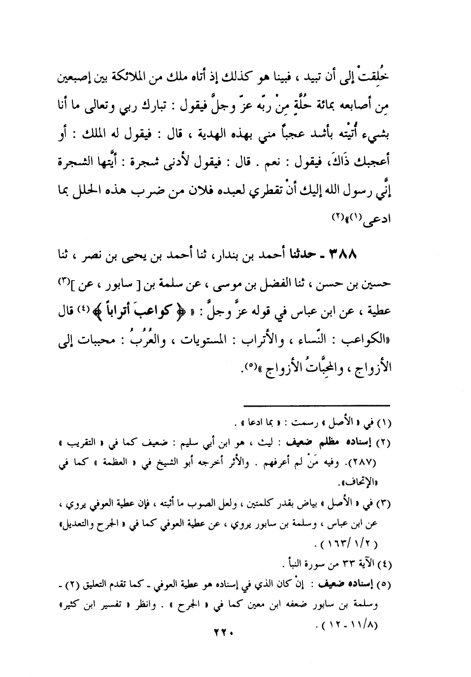 388 - حَدَّثَنَا أَحْمَدُ بْنُ بُنْدَارٍ، ثنا أَحْمَدُ بْنُ يَحْيَى بْنِ نَصْرٍ، ثنا حُسَيْنُ بْنُ حَسَنٍ، ثنا الْفَضْلُ بْنُ مُوسَى، عَنْ سَلَمَةَ بْنِ سَابُورٍ، عَنْ عَطِيَّةَ , عَنِ ابْنِ عَبَّاسٍ، فِي قَوْلِهِ عَزَّ وَجَلَّ {كَوَاعِبَ أَتْرَابًا} [النبأ: 33] قَالَ: " §الْكَوَاعِبُ: النِّسَاءُ، وَالْأَتْرَابُ: الْمُسْتَوِيَاتُ، وَالْعُرُبُ: مُحَبَّبَاتٌ إِلَى الْأَزْوَاجِ، وَالْمُحِبَّاتُ الْأَزْوَاجَ