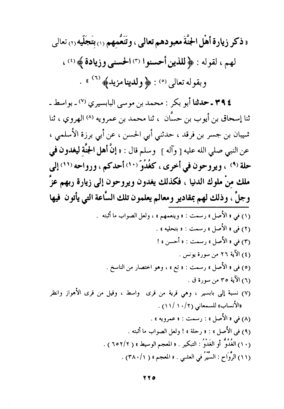 394 - حَدَّثَنَا أَبُو بَكْرٍ مُحَمَّدُ بْنُ مُوسَى الْبَابَسِيرِيُّ بِوَاسِطَ، ثنا إِسْحَاقُ بْنُ أَيُّوبَ بْنِ حَسَّانَ، ثنا مُحَمَّدُ بْنُ عَمْرَوَيْهِ الْهَرَوِيُّ، ثنا شَيْبَانُ بْنُ جَسْرِ بْنِ فَرْقَدٍ، حَدَّثَنِي أَبِي، عَنِ الْحَسَنِ , عَنْ أَبِي بَرْزَةَ السُّلَمِيِّ، عَنِ النَّبِيِّ صَلَّى اللَّهُ عَلَيْهِ وَآلِهِ وَسَلَّمَ قَالَ: إِنَّ §أَهْلَ الْجَنَّةِ لَيَغْدُونَ فِي حُلَّةٍ، وَيَرُوحُونَ فِي أُخْرَى، كَغُدُوِّ أَحَدِكُمْ، وَرَوَاحِهِ إِلَى مَلِكٍ مِنْ مُلُوكِ الدُّنْيَا، فَكَذَلِكَ يَغْدُونَ وَيَرُوحُونَ إِلَى زِيَارَةِ رَبِّهِمْ عَزَّ وَجَلَّ، وَذَلِكَ لَهُمْ بِمَقَادِيرَ وَمَعَالِمَ يَعْلَمُونَ تِلْكَ السَّاعَةَ الَّتِي يَأْتُونَ فِيهَا -[226]- رَبَّهُمْ عَزَّ وَجَلَّ وَرَوَاهُ جَعْفَرُ بْنُ جَسْرِ بْنِ فَرْقَدٍ، عَنْ أَبِيهِ مِثْلَهُ