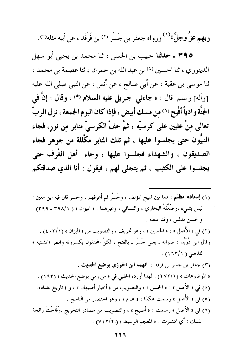395 - حَدَّثَنَا حَبِيبُ بْنُ الْحَسَنِ، ثنا مُحَمَّدُ بْنُ يَحْيَى أَبُو سَهْلٍ الدِّينَوَرِيُّ، ثنا الْحُسَيْنُ بْنُ عَبْدِ اللَّهِ بْنِ حُمْرَانَ، ثنا عِصْمَةُ بْنُ مُحَمَّدٍ، ثنا مُوسَى بْنُ عُقْبَةَ، عَنْ أَبِي صَالِحٍ , عَنْ أَنَسٍ، عَنِ النَّبِيِّ صَلَّى اللَّهُ عَلَيْهِ وَآلِهِ وَسَلَّمَ قَالَ: " جَاءَنِي جِبْرِيلُ عَلَيْهِ السَّلَامُ، وَقَالَ: إِنَّ §فِي الْجَنَّةِ وَادِيًا أَفْيَحَ مِنْ مِسْكٍ أَبْيَضَ، فَإِذَا كَانَ يَوْمُ الْجُمُعَةِ، نَزَلَ الرَّبُّ تَبَارَكَ وَتَعَالَى مِنْ عِلِّيِّينَ عَلَى كُرْسِيِّهِ، ثُمَّ حُفَّ الْكُرْسِيُّ مَنَابِرَ مِنْ نُورٍ، فَجَاءَ النَّبِيُّونَ حَتَّى يَجْلِسُوا عَلَيْهَا، ثُمَّ حَفَّ تِلْكَ الْمَنَابِرَ مُكَلَّلَةً مِنْ جَوْهَرٍ فَجَاءَ الصِّدِّيقُونَ، وَالشُّهَدَاءُ فَجَلَسُوا عَلَيْهَا، وَجَاءَ أَهْلُ الْغُرَفِ حَتَّى يَجْلِسُوا عَلَى الْكَثِيبِ، ثُمَّ يَتَجَلَّى لَهُمْ، فَيَقُولُ: أَنَا الَّذِي صَدَقْتُكُمْ -[227]- وَعْدِي، وَأَتْمَمْتُ عَلَيْكُمْ نِعْمَتِي، وَهَذَا مَحَلُّ كَرَامَتِي، فَاسْأَلُونِي فَيَسْأَلُونَهُ حَتَّى تَنْتَهِيَ بِهِمْ رَغْبَتُهُمْ، ثُمَّ يُفْتَحُ لَهُمْ عَمَّا لَمْ تَرَ عَيْنٌ، وَلَمْ يَخْطُرْ عَلَى قَلْبِ بَشَرٍ، إِلَى قَدْرِ مُنْصَرَفِهِمْ مِنَ الْجُمُعَةِ، فَهِيَ يَاقُوتَةٌ حَمْرَاءُ، وَزَبَرْجَدَةٌ خَضْرَاءُ مُطَّرِدَةٌ، فِيهَا أَنْهَارُهَا، وَفِيهَا ثِمَارُهَا، وَأَزْوَاجُهَا، وَخَدَمُهَا، فَلَيْسُوا أَشْوَقَ مِنْهُمْ إِلَى يَوْمِ الْجُمُعَةِ لِيَزْدَادُوا نَظَرًا إِلَى رَبِّهِمْ عَزَّ وَجَلَّ