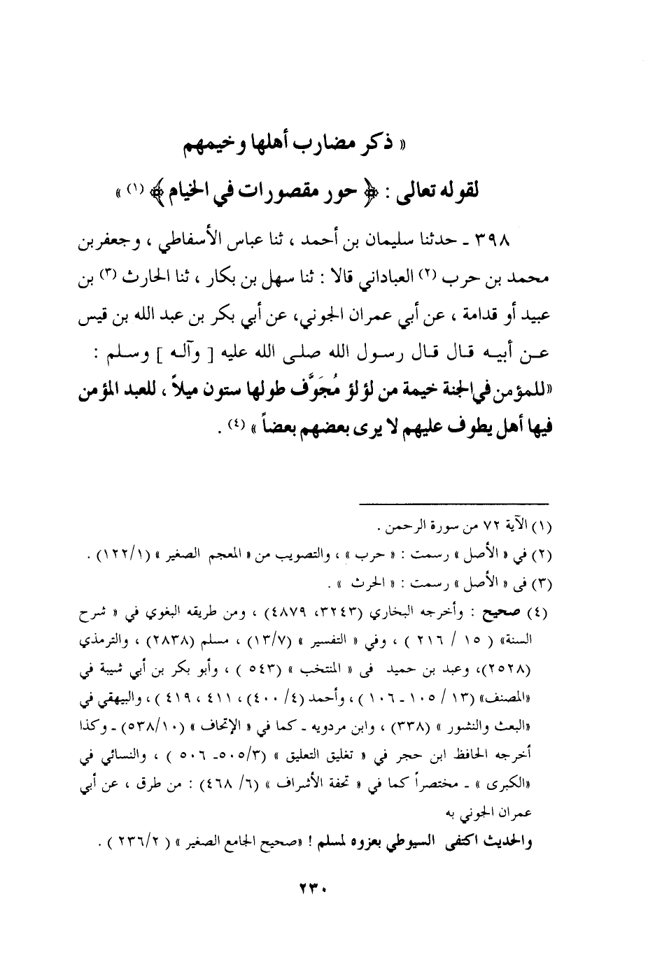 398 - حَدَّثَنَا سُلَيْمَانُ بْنُ أَحْمَدَ، ثنا عَبَّاسٌ الْأَسْفَاطِيُّ، وَجَعْفَرُ بْنُ مُحَمَّدِ بْنِ حَرْبٍ الْعَبَّادَانِيُّ، قَالَا: ثنا سَهْلُ بْنُ بَكَّارٍ، ثنا الْحَارِثُ بْنُ عُبَيْدٍ، أَوْ قُدَامَةُ، عَنْ أَبِي عِمْرَانَ الْجَوْنِيِّ، عَنْ أَبِي بَكْرِ بْنِ عَبْدِ اللَّهِ بْنِ قَيْسٍ، عَنْ أَبِيهِ، قَالَ: قَالَ رَسُولُ اللَّهِ صَلَّى اللَّهُ عَلَيْهِ وَآلِهِ وَسَلَّمَ: §، لِلْمُؤْمِنِ فِي الْجَنَّةِ خَيْمَةٌ مِنْ لُؤْلُؤٍ مُجَوَّفٍ طُولُهَا سِتُّونَ مِيلًا، لِلْعَبْدِ الْمُؤْمِنِ فِيهَا أَهْلٌ يَطُوفُ عَلَيْهِمْ لَا يَرَى بَعْضُهُمْ بَعْضًا