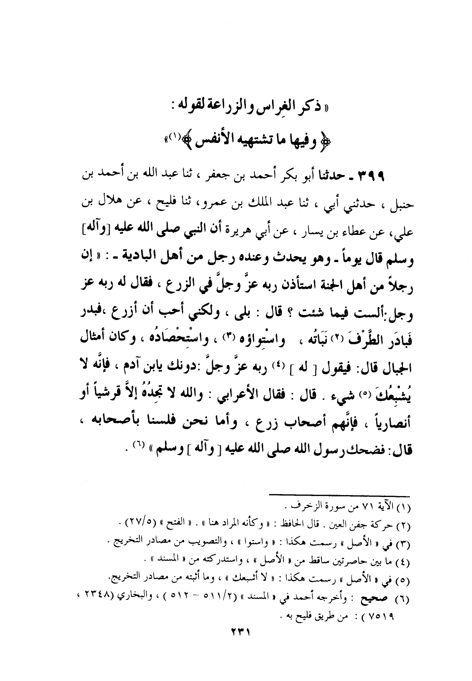 399 - حَدَّثَنَا أَبُو بَكْرٍ أَحْمَدُ بْنُ جَعْفَرٍ، ثنا عَبْدُ اللَّهِ بْنُ أَحْمَدَ بْنِ حَنْبَلٍ، حَدَّثَنِي أَبِي، ثنا عَبْدُ الْمَلِكِ بْنُ عَمْرٍو، ثنا فُلَيْحٌ، عَنْ هِلَالِ بْنِ عَلِيٍّ، عَنْ عَطَاءِ بْنِ يَسَارٍ , عَنْ أَبِي هُرَيْرَةَ، أَنَّ النَّبِيَّ صَلَّى اللَّهُ عَلَيْهِ وَآلِهِ وَسَلَّمَ قَالَ يَوْمًا، وَهُوَ يُحَدِّثُ وَعِنْدَهُ رَجُلٌ مِنْ أَهْلِ الْبَادِيَةِ: إِنَّ §رَجُلًا مِنْ أَهْلِ الْجَنَّةِ اسْتَأْذَنَ رَبَّهُ عَزَّ وَجَلَّ فِي الزَّرْعِ، فَقَالَ لَهُ رَبُّهُ عَزَّ وَجَلَّ: أَلَسْتَ فِيمَا شِئْتَ؟ قَالَ: بَلَى، وَلَكِنِّي أُحِبُّ أَنْ أَزْرَعَ، فَبَدَرَ فَبَادَرَ الطَّرْفَ نَبَاتُهُ، وَاسْتِوَاؤُهُ، وَاسْتِحْصَادُهُ، وَكَانَ أَمْثَالَ الْجِبَالِ قَالَ: فَيَقُولُ لَهُ رَبُّهُ عَزَّ وَجَلَّ: دُونَكَ يَا ابْنَ آدَمَ، فَإِنَّهُ لَا يُشْبِعُكَ شَيْءٌ قَالَ: فَقَالَ الْأَعْرَابِيُّ: وَاللَّهِ لَا تَجِدُهُ إِلَّا قُرَشِيًّا أَوْ أَنْصَارِيًّا، فَإِنَّهُمْ أَصْحَابُ زَرْعٍ، وَأَمَّا نَحْنُ فَلَسْنَا بِأَصْحَابِهِ، قَالَ: فَضَحِكَ رَسُولُ اللَّهِ صَلَّى اللَّهُ عَلَيْهِ وَآلِهِ وَسَلَّمَ