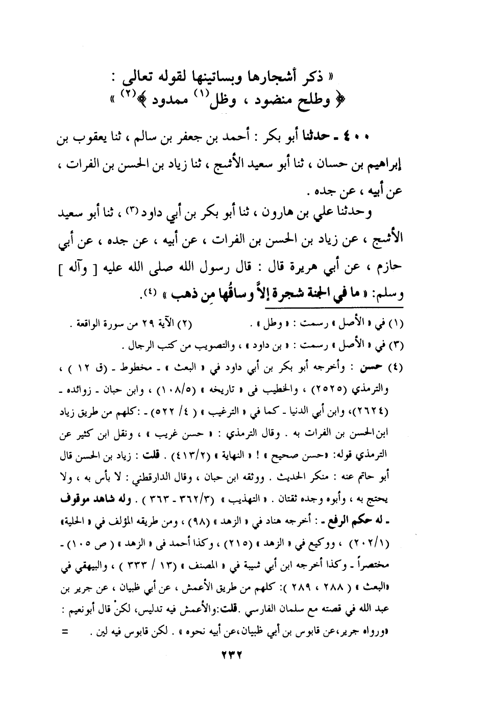 400 - حَدَّثَنَا أَبُو بَكْرٍ أَحْمَدُ بْنُ جَعْفَرِ بْنِ سَلْمٍ، ثنا يَعْقُوبُ بْنُ إِبْرَاهِيمَ بْنِ حَسَّانَ، ثنا أَبُو سَعِيدٍ الْأَشَجُّ، ثنا زِيَادُ بْنُ الْحَسَنِ بْنِ الْفُرَاتِ، عَنْ أَبِيهِ، عَنْ جَدِّهِ، وَحَدَّثَنَا عَلِيُّ بْنُ هَارُونَ، ثنا أَبُو بَكْرِ بْنُ أَبِي دَاوُدَ، ثنا أَبُو سَعِيدٍ الْأَشَجُّ، عَنْ زِيَادِ بْنِ الْحَسَنِ بْنِ الْفُرَاتِ، عَنْ أَبِيهِ، عَنْ جَدِّهِ، عَنْ أَبِي حَازِمٍ , عَنْ أَبِي هُرَيْرَةَ، قَالَ: قَالَ رَسُولُ اللَّهِ صَلَّى اللَّهُ عَلَيْهِ وَآلِهِ وَسَلَّمَ: §، مَا فِي الْجَنَّةِ شَجَرَةٌ إِلَّا وَسَاقُهَا مِنْ ذَهَبٍ