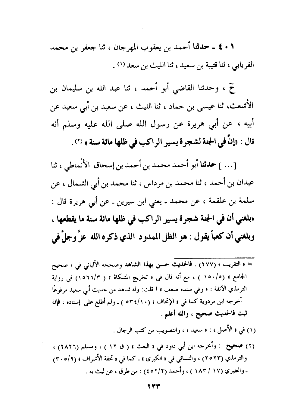 401 - حَدَّثَنَا أَحْمَدُ بْنُ يَعْقُوبَ بْنِ الْمِهْرَجَانِ، ثنا جَعْفَرُ بْنُ مُحَمَّدٍ الْفِرْيَابِيُّ، ثنا قُتَيْبَةُ بْنُ سَعِيدٍ، ثنا اللَّيْثُ بْنُ سَعْدٍ، ح، وَحَدَّثَنَا الْقَاضِي أَبُو أَحْمَدَ، ثنا عَبْدُ اللَّهِ بْنُ سُلَيْمَانَ بْنِ الْأَشْعَثِ، ثنا عِيسَى بْنُ حَمَّادٍ، ثنا اللَّيْثُ، عَنْ سَعِيدِ بْنِ أَبِي سَعِيدٍ، عَنْ أَبِيهِ , عَنْ أَبِي هُرَيْرَةَ، عَنْ رَسُولِ اللَّهِ صَلَّى اللَّهُ عَلَيْهِ وَآلِهِ وَسَلَّمَ أَنَّهُ قَالَ: إِنَّ §فِي الْجَنَّةِ لَشَجَرَةً يَسِيرُ الرَّاكِبُ فِي ظِلِّهَا مِائَةَ سَنَةٍ
