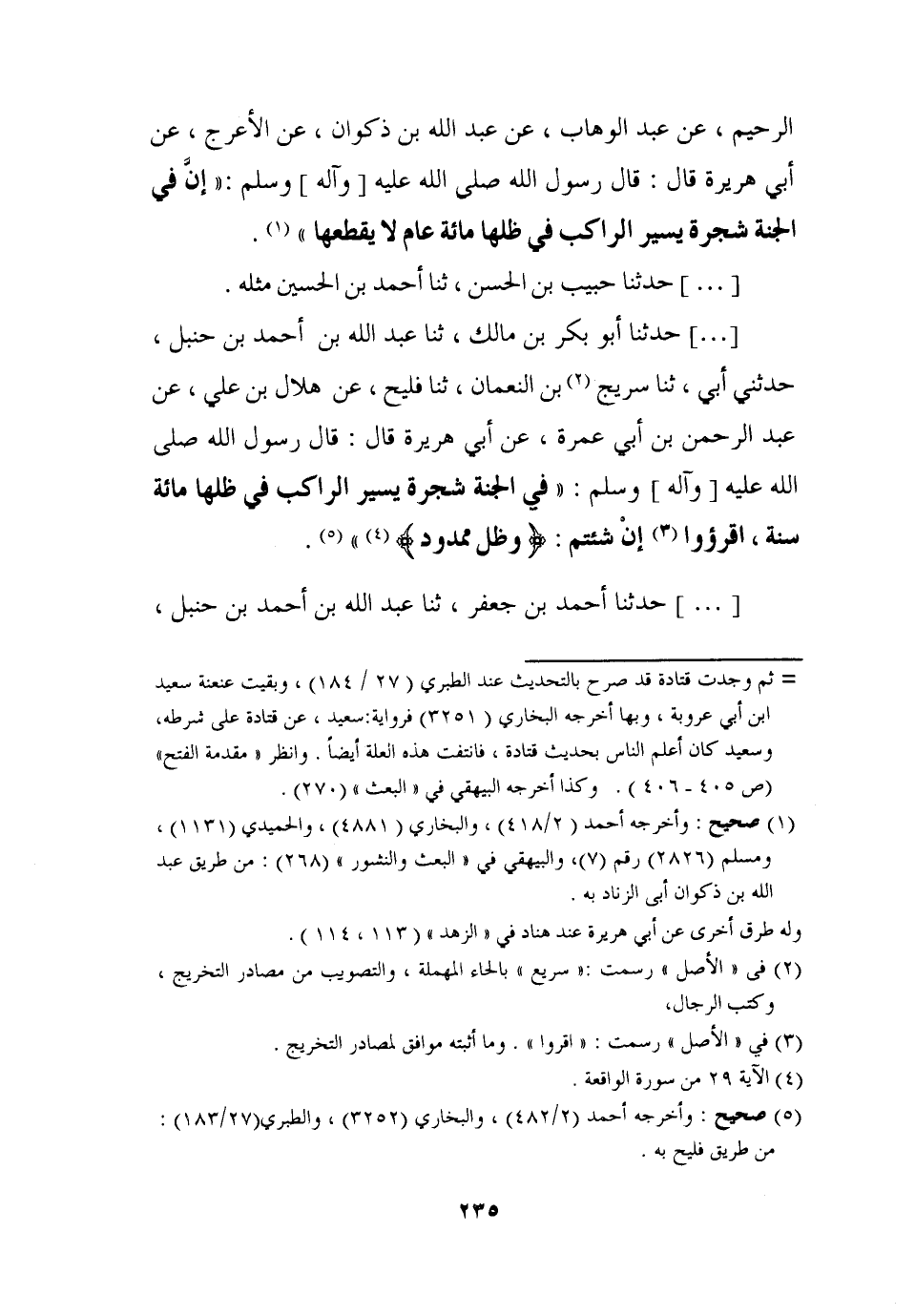( ... ) - حَدَّثَنَا أَبُو بَكْرِ بْنُ مَالِكٍ، ثنا عَبْدُ اللَّهِ بْنُ أَحْمَدَ بْنِ حَنْبَلٍ، حَدَّثَنِي أَبِي، ثنا سُرَيْجُ بْنُ النُّعْمَانِ، ثنا فُلَيْحٌ، عَنْ هِلَالِ بْنِ عَلِيٍّ، عَنْ عَبْدِ الرَّحْمَنِ بْنِ أَبِي عَمْرَةَ , عَنْ أَبِي هُرَيْرَةَ قَالَ: قَالَ رَسُولُ اللَّهِ صَلَّى اللَّهُ عَلَيْهِ وَآلِهِ وَسَلَّمَ: §فِي الْجَنَّةِ شَجَرَةٌ يَسِيرُ الرَّاكِبُ فِي ظِلِّهَا مِائَةَ سَنَةٍ، اقْرَءُوا إِنْ شِئْتُمْ {وَظِلٍّ مَمْدُودٍ} [الواقعة: 30]