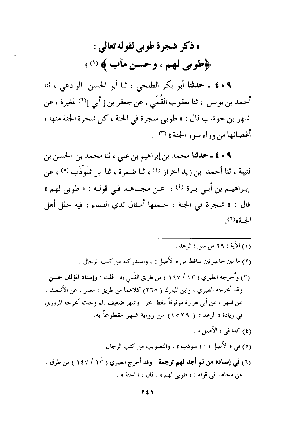 409 - حَدَّثَنَا أَبُو بَكْرٍ الطَّلْحِيُّ، ثنا أَبُو حَسَنٍ الْوَادِعِيُّ، ثنا أَحْمَدُ بْنُ يُونُسَ، ثنا يَعْقُوبُ الْقُمِّيُّ، عَنْ جَعْفَرِ بْنِ أَبِي الْمُغِيرَةِ , عَنْ شَهْرِ بْنِ حَوْشَبٍ، قَالَ: " §طُوبَى شَجَرَةٌ فِي الْجَنَّةِ، كُلُّ شَجَرَةِ الْجَنَّةِ مِنْهَا، أَغْصَانُهَا مِنْ وَرَاءِ سُورِ الْجَنَّةِ