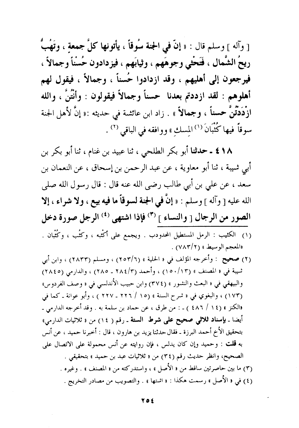418 - حَدَّثَنَا أَبُو بَكْرٍ الطَّلْحِيُّ، ثنا عُبَيْدُ بْنُ غَنَّامٍ، ثنا أَبُو بَكْرِ بْنُ أَبِي شَيْبَةَ، ثنا أَبُو مُعَاوِيَةَ، عَنْ عَبْدِ الرَّحْمَنِ بْنِ إِسْحَاقَ، عَنِ النُّعْمَانِ بْنِ سَعْدٍ , عَنْ عَلِيِّ بْنِ أَبِي طَالِبٍ، رَضِيَ اللَّهُ عَنْهُ قَالَ: قَالَ رَسُولُ اللَّهِ صَلَّى اللَّهُ عَلَيْهِ وَآلِهِ وَسَلَّمَ: إِنَّ §فِي الْجَنَّةِ لَسُوقًا مَا فِيهَا بَيْعٌ وَلَا شِرَاءٌ، إِلَّا الصُّوَرُ مِنَ الرِّجَالِ وَالنِّسَاءِ فَإِذَا اشْتَهَى الرَّجُلُ صُورَةً دَخَلَ -[255]- فِيهَا، وَإِنَّ فِيهَا لَمُجْتَمَعًا لِلْحُورِ الْعِينِ، يَرْفَعْنَ بِأَصْوَاتٍ لَمْ تَرَ الْخَلَائِقُ مِثْلَهَا يَقُلْنَ: نَحْنُ الْخَالِدَاتُ فَلَا نَبِيدُ، وَنَحْنُ الرَّاضِيَاتُ فَلَا نَسْخَطُ، وَنَحْنُ النَّاعِمَاتُ فَلَا نَبْأَسُ، فَطُوبَى لِمَنْ كَانَ لَنَا وَكُنَّا لَهُ