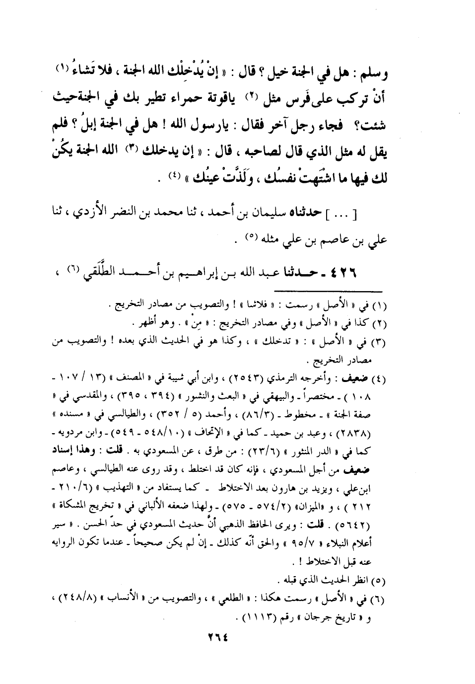 426 - حَدَّثَنَا عَبْدُ اللَّهِ بْنُ إِبْرَاهِيمَ بْنِ أَحْمَدَ الطَّلَقِيُّ، -[265]- ثنا أَبُو نُعَيْمِ بْنُ عَدِيٍّ، ثنا مُحَمَّدُ بْنُ عِيسَى، ثنا أَحْمَدُ بْنُ أَبِي طَيْبَةَ، عَنْ أَبِيهِ، عَنْ عَلْقَمَةَ، عَنْ أَبِي صَالِحٍ , عَنْ أَبِي هُرَيْرَةَ، أَنَّ أَعْرَابِيًّا، قَالَ: يَا رَسُولَ اللَّهِ، أَفِي الْجَنَّةِ إِبِلٌ؟ قَالَ: يَا أَعْرَابِيُّ، إِنْ يُدْخِلْكَ اللَّهُ الْجَنَّةَ رَأَيْتَ §فِيهَا مَا تَشْتَهِي نَفْسُكَ، وَتَلَذُّ عَيْنُكَ