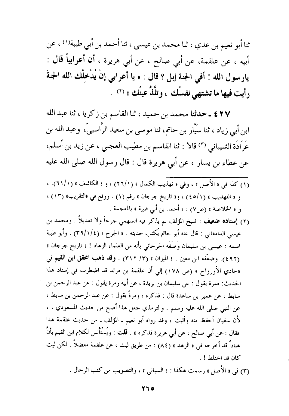 427 - حَدَّثَنَا مُحَمَّدُ بْنُ حُمَيْدٍ، ثنا الْقَاسِمُ بْنُ زَكَرِيَّا، ثنا عَبْدُ اللَّهِ بْنُ أَبِي زِيَادٍ، ثنا سَيَّارُ بْنُ حَاتِمٍ، ثنا مُوسَى بْنُ سَعِيدٍ الرَّاسِبِيُّ، وَعَبْدُ اللَّهِ بْنُ عَرَادَةَ الشَّيْبَانِيُّ، قَالَا: ثنا الْقَاسِمُ بْنُ مُطَيَّبٍ الْعِجْلِيُّ، عَنْ زَيْدِ بْنِ أَسْلَمَ، عَنْ عَطَاءِ بْنِ يَسَارٍ , عَنْ أَبِي هُرَيْرَةَ، قَالَ: قَالَ رَسُولُ اللَّهِ صَلَّى اللَّهُ عَلَيْهِ -[266]- وَآلِهِ وَسَلَّمَ: وَذَكَرَ الْجَنَّةَ فَقَالَ: " §وَالْفِرْدَوْسُ أَعْلَاهَا سُمُوًّا وَأَوْسَعُهَا مَحِلَّةً، وَمِنْهَا تَفَجَّرُ أَنْهَارُ الْجَنَّةِ، وَعَلَيْهَا يُوضَعُ الْعَرْشُ يَوْمَ الْقِيَامَةِ، فَقَامَ إِلَيْهِ رَجُلٌ فَقَالَ: يَا رَسُولَ اللَّهِ، إِنِّي رَجُلٌ حُبِّبَ إِلَيَّ الْخَيْلُ، فَهَلْ فِي الْجَنَّةِ خَيْلٌ؟ قَالَ: إِي وَالَّذِي نَفْسِي بِيَدِهِ، إِنَّ فِي الْجَنَّةِ لَخَيْلًا، وَإِبِلًا هَفَّافَةً تَزِفُّ بَيْنَ خِلَالِ وَرَقِ الْجَنَّةِ يَتَزَاوَرُونَ عَلَيْهَا حَيْثُ شَاءُوا، فَقَامَ إِلَيْهِ رَجُلٌ فَقَالَ: يَا رَسُولَ اللَّهِ، إِنِّي رَجُلٌ حُبِّبَ إِلَيَّ الْإِبِلُ. الْحَدِيثَ بِطُولِهِ ( ... ) حَدَّثَنَا الْقَاضِي أَبُو أَحْمَدَ، ثنا عُمَرُ بْنُ سَهْلٍ، ثنا مُحَمَّدُ بْنُ الْمُغِيرَةِ، ثنا الْقَاسِمُ بْنُ الْحَكَمِ، ثنا أَبُو يُوسُفَ، عَنْ مِيكَائِيلَ، عَنْ عَلْقَمَةَ بْنِ مَرْثَدٍ، عَنْ يَحْيَى بْنِ إِسْحَاقَ، عَنْ عَطَاءِ بْنِ يَسَارٍ، عَنْ أَبِي هُرَيْرَةَ قَالَ: قَالَ رَسُولُ اللَّهِ صَلَّى اللَّهُ عَلَيْهِ وَآلِهِ وَسَلَّمَ: الْفِرْدَوْسُ، الْحَدِيثَ