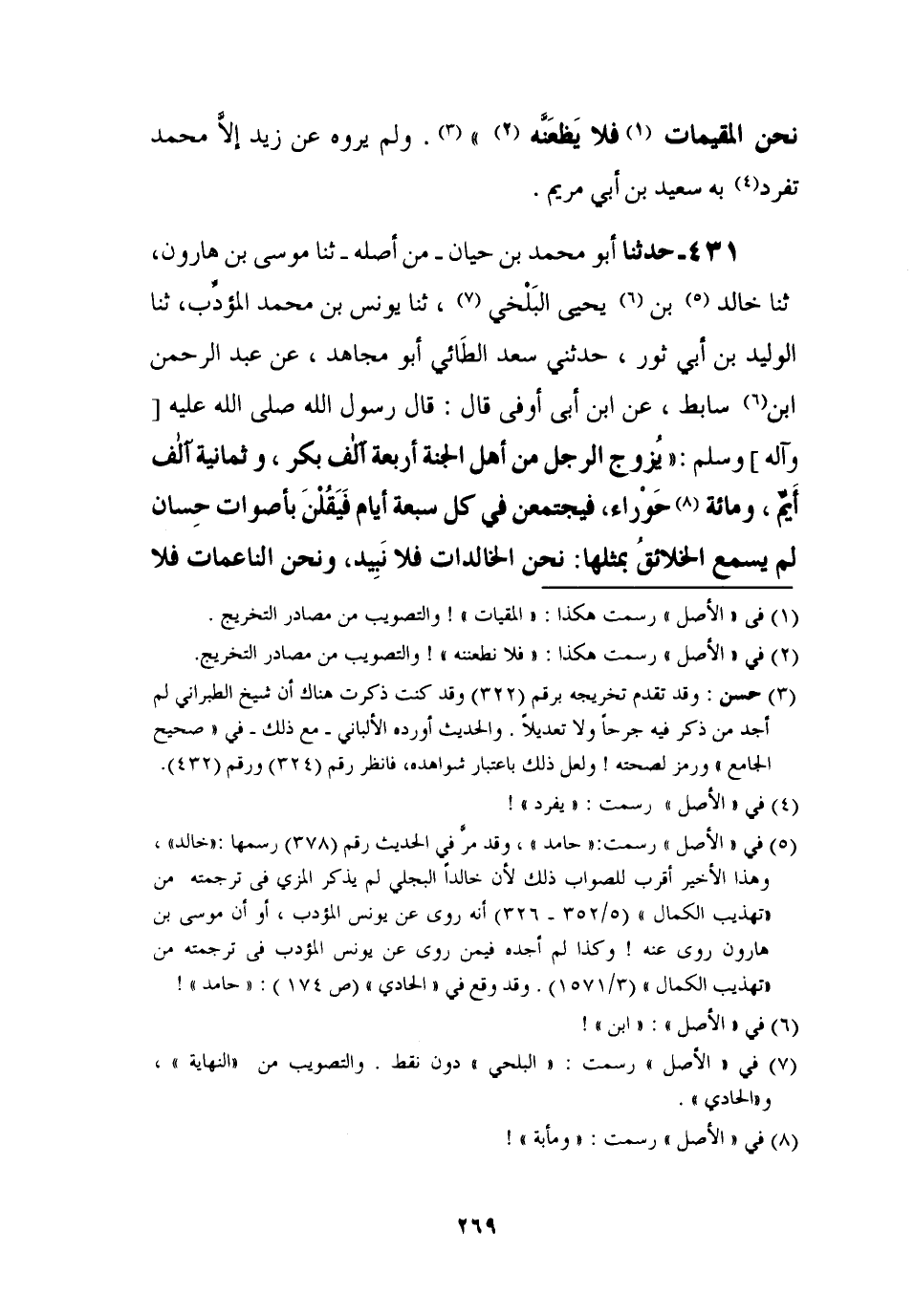431 - حَدَّثَنَا أَبُو مُحَمَّدِ بْنُ حَيَّانَ، مِنْ أَصْلِهِ، ثنا مُوسَى بْنُ هَارُونَ، ثنا خَالِدُ بْنُ يَحْيَى الْبَلْخِيُّ، ثنا يُونُسُ بْنُ مُحَمَّدٍ الْمُؤَدِّبُ، ثنا الْوَلِيدُ بْنُ أَبِي ثَوْرٍ، حَدَّثَنِي سَعْدٌ الطَّائِيُّ أَبُو مُجَاهِدٍ، عَنْ عَبْدِ الرَّحْمَنِ بْنِ سَابِطٍ , عَنِ ابْنِ أَبِي أَوْفَى، قَالَ: قَالَ رَسُولُ اللَّهِ صَلَّى اللَّهُ عَلَيْهِ وَآلِهِ وَسَلَّمَ:، §يُزَوَّجُ الرَّجُلُ مِنْ أَهْلِ الْجَنَّةِ أَرْبَعَةَ آلَافِ بِكْرٍ، وَثَمَانِيَةَ آلَافِ أَيِّمٍ وَمِائَةَ حَوْرَاءَ، فَيَجْتَمِعْنَ فِي كُلِّ سَبْعَةِ أَيَّامٍ فَيَقُلْنَ بِأَصْوَاتٍ حِسَانٍ لَمْ يَسْمَعِ الْخَلَائِقُ بِمِثْلِهَا: نَحْنُ الْخَالِدَاتُ فَلَا نَبِيدُ، وَنَحْنُ النَّاعِمَاتُ فَلَا -[270]- نَبْؤُسُ، وَنَحْنُ الرَّاضِيَاتُ فَلَا نَسْخَطُ، وَنَحْنُ الْمُقِيمَاتُ فَلَا نَظْعَنُ طُوبَى لِمَنْ كَانَ لَنَا وَكُنَّا لَهُ