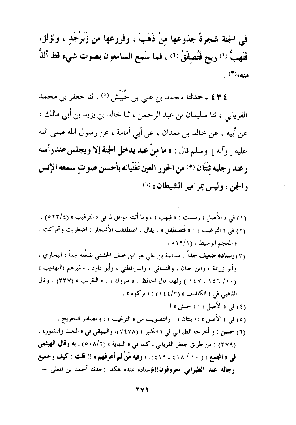 434 - حَدَّثَنَا مُحَمَّدُ بْنُ عَلِيِّ بْنِ حُبَيْشٍ، ثنا جَعْفَرُ بْنُ مُحَمَّدٍ الْفِرْيَابِيُّ، ثنا سُلَيْمَانُ بْنُ عَبْدِ الرَّحْمَنِ، ثنا خَالِدُ بْنُ يَزِيدَ بْنِ أَبِي مَالِكٍ، عَنْ أَبِيهِ، عَنْ خَالِدِ بْنِ مَعْدَانَ , عَنْ أَبِي أُمَامَةَ، عَنْ رَسُولِ اللَّهِ صَلَّى اللَّهُ عَلَيْهِ وَآلِهِ وَسَلَّمَ قَالَ: §مَا مِنْ عَبْدٍ يَدْخُلُ الْجَنَّةَ إِلَّا وَيَجْلِسُ عَنْ رَأْسِهِ وَعِنْدَ رِجْلَيْهِ ثِنْتَانِ مِنَ الْحُورِ الْعِينِ تُغَنِّيَانِهِ بِأَحْسَنِ صَوْتٍ سَمِعَهُ الْإِنْسُ وَالْجِنُّ، وَلَيْسَ بِمَزَامِيرِ الشَّيْطَانِ -[273]-