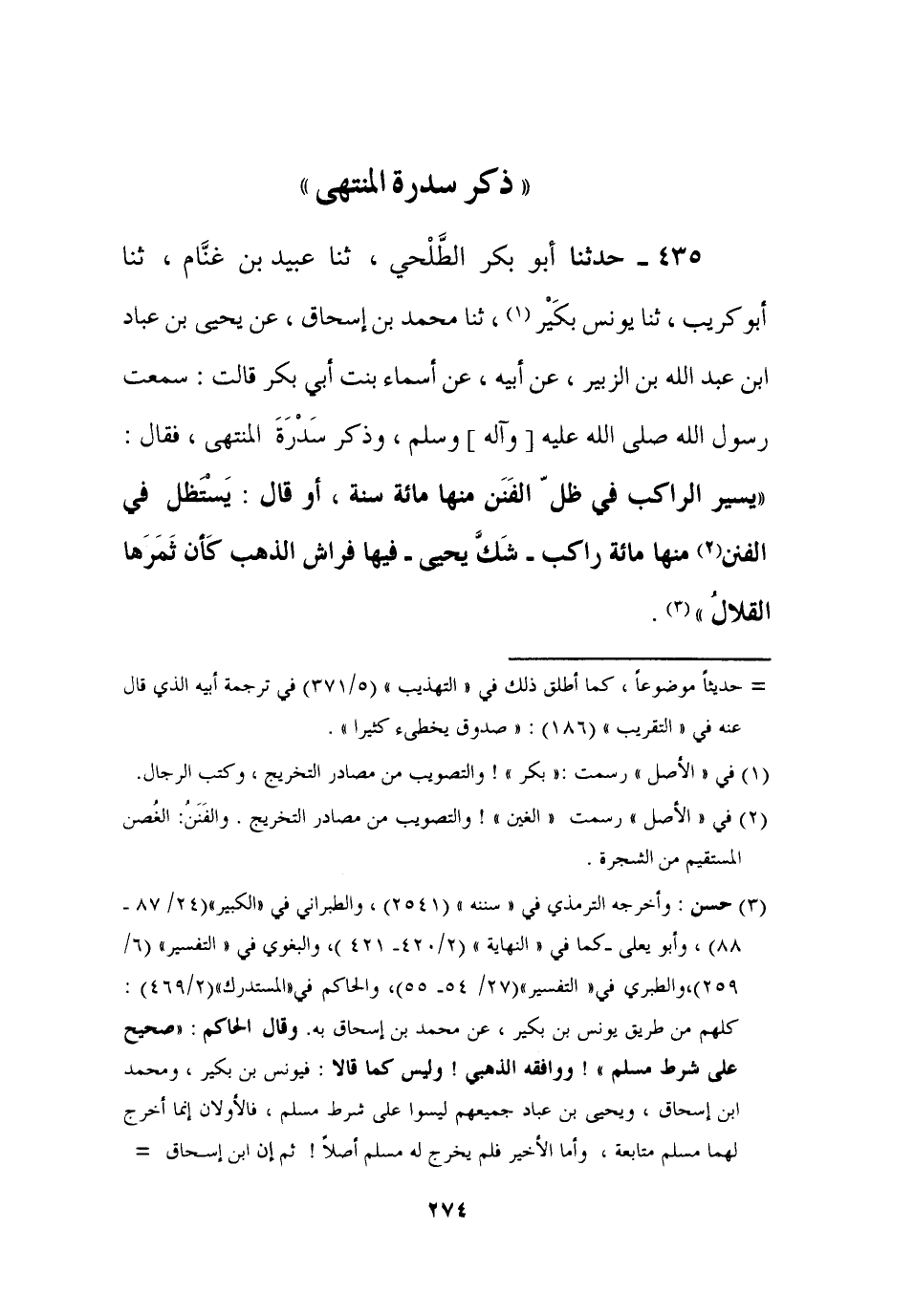 435 - حَدَّثَنَا أَبُو بَكْرٍ الطَّلْحِيُّ، ثنا عُبَيْدُ بْنُ غَنَّامٍ، ثنا أَبُو كُرَيْبٍ، ثنا يُونُسُ بْنُ بُكَيْرٍ، ثنا مُحَمَّدُ بْنُ إِسْحَاقَ، عَنْ يَحْيَى بْنِ عَبَّادِ بْنِ عَبْدِ اللَّهِ بْنِ الزُّبَيْرِ، عَنْ أَبِيهِ , عَنْ أَسْمَاءَ بِنْتِ أَبِي بَكْرٍ، قَالَتْ: سَمِعْتُ رَسُولَ اللَّهِ صَلَّى اللَّهُ عَلَيْهِ وَآلِهِ وَسَلَّمَ، وَذَكَرَ سِدْرَةَ الْمُنْتَهَى، فَقَالَ: " §يَسِيرُ الرَّاكِبُ فِي ظِلِّ الْفَنَنِ مِنْهَا مِائَةَ سَنَةٍ، أَوْ قَالَ: يَسْتَظِلُّ فِي الْفَنَنِ مِنْهَا مِائَةُ رَاكِبٍ، شَكَّ يَحْيَى، فِيهَا فِرَاشُ الذَّهَبِ كَأَنَّ ثَمَرَهَا الْقِلَالُ
