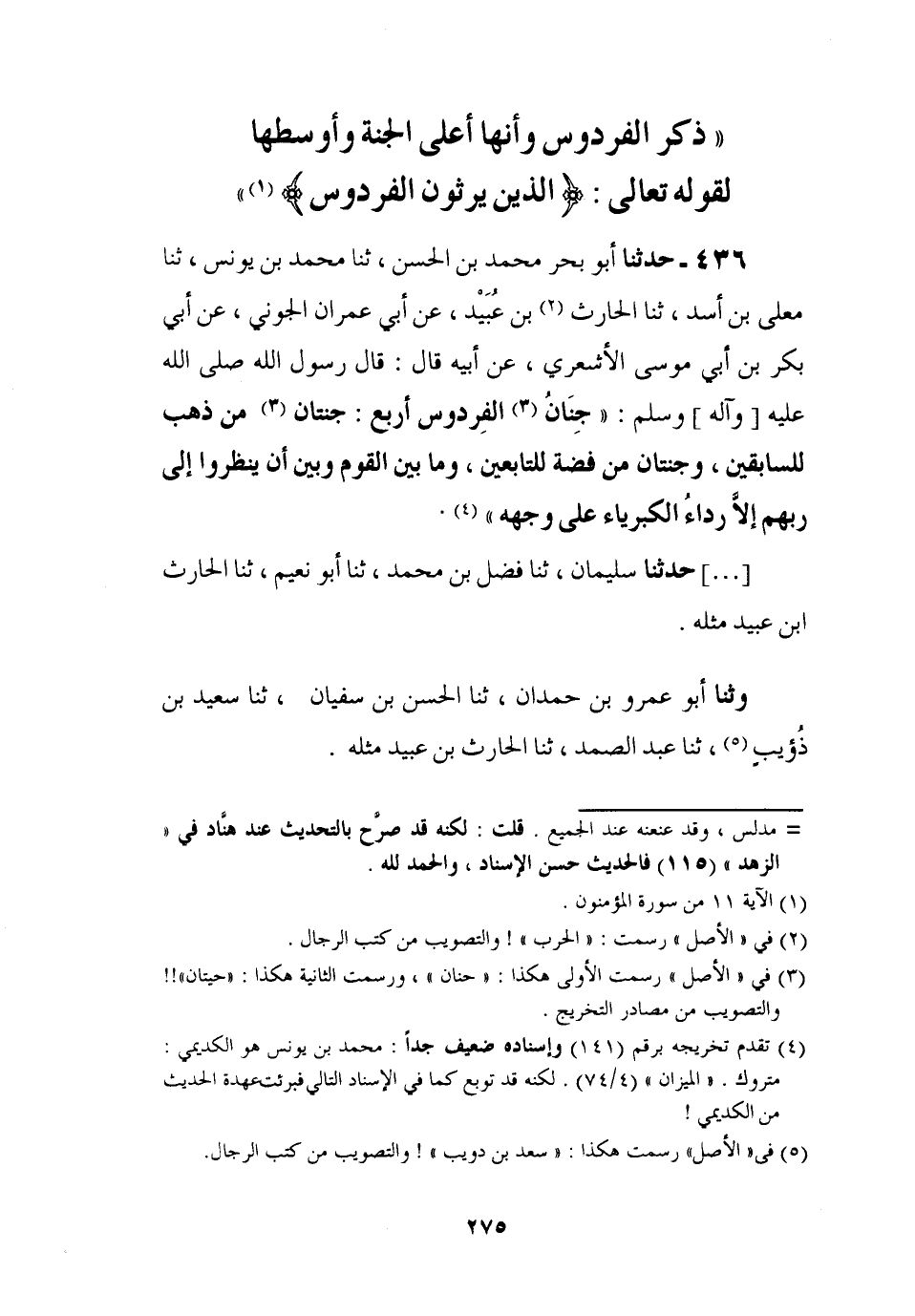 436 - حَدَّثَنَا أَبُو بَحْرٍ مُحَمَّدُ بْنُ الْحَسَنِ، ثنا مُحَمَّدُ بْنُ يُونُسَ، ثنا مُعَلَّى بْنُ أَسَدٍ، ثنا الْحَارِثُ بْنُ عُبَيْدٍ، عَنْ أَبِي عِمْرَانَ الْجَوْنِيِّ، عَنْ أَبِي بَكْرِ بْنِ أَبِي مُوسَى الْأَشْعَرِيِّ، عَنْ أَبِيهِ، قَالَ: قَالَ رَسُولُ اللَّهِ صَلَّى اللَّهُ عَلَيْهِ وَآلِهِ وَسَلَّمَ:، §جِنَانُ الْفِرْدَوْسِ أَرْبَعٌ: جَنَّتَانِ مِنْ ذَهَبٍ لِلسَّابِقِينَ، وَجَنَّتَانِ مِنْ فِضَّةٍ لِلتَّابِعِينَ، وَمَا بَيْنَ الْقَوْمِ وَبَيْنَ أَنْ يَنْظُرُوا إِلَى رَبِّهِمْ إِلَّا رِدَاءُ الْكِبْرِيَاءِ عَلَى وَجْهِهِ
