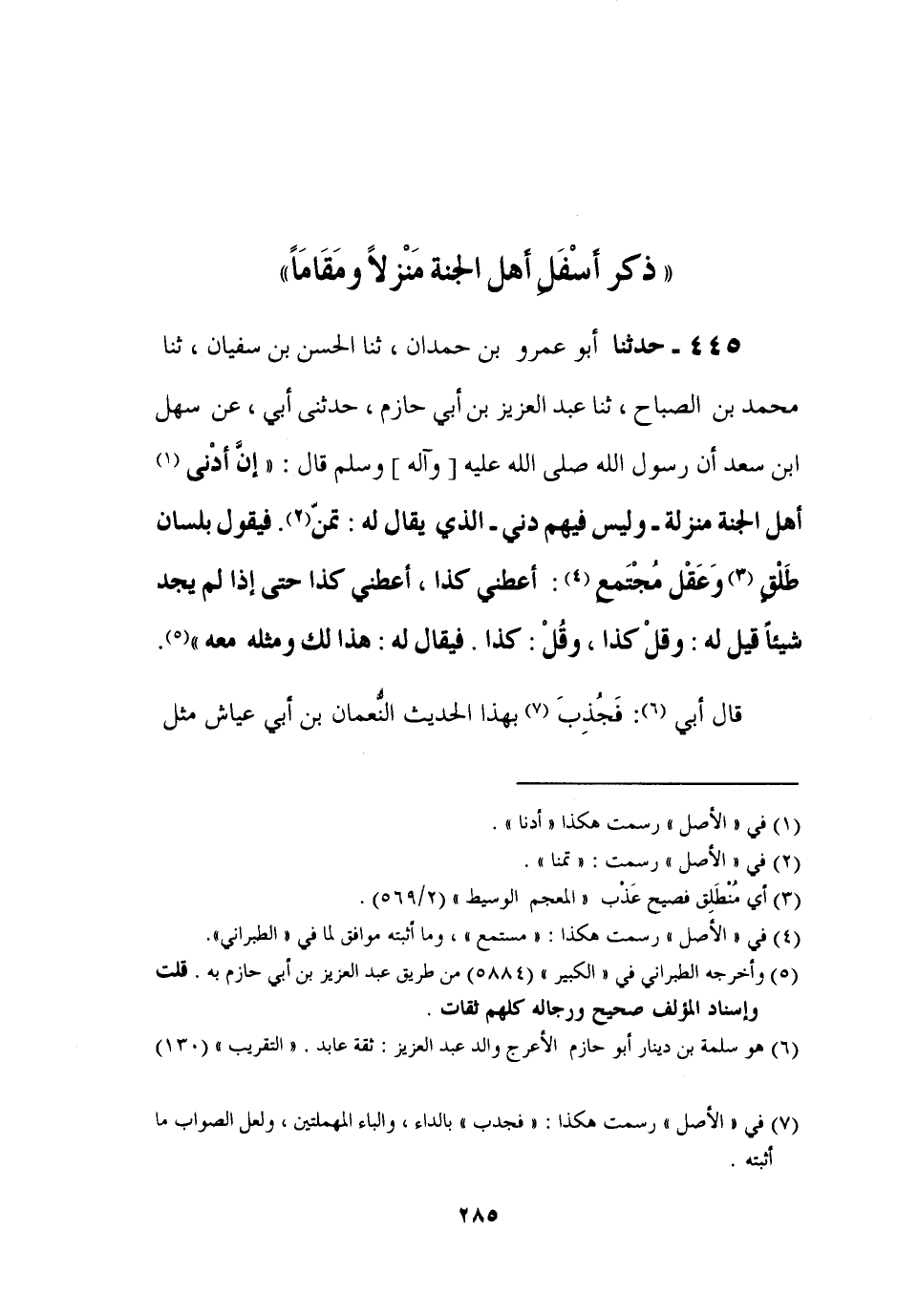 445 - حَدَّثَنَا أَبُو عَمْرِو بْنُ حَمْدَانَ، ثنا الْحَسَنُ بْنُ سُفْيَانَ، ثنا مُحَمَّدُ بْنُ الصَّبَّاحِ، ثنا عَبْدُ الْعَزِيزِ بْنُ أَبِي حَازِمٍ، حَدَّثَنِي أَبِي , عَنْ سَهْلِ بْنِ سَعْدٍ، أَنَّ رَسُولَ اللَّهِ صَلَّى اللَّهُ عَلَيْهِ وَآلِهِ وَسَلَّمَ قَالَ: إِنَّ §أَدْنَى أَهْلِ الْجَنَّةِ مَنْزِلَةً، وَلَيْسَ فِيهِمْ دَنِيُّ، الَّذِي يُقَالُ لَهُ: تَمَنَّ. فَيَقُولُ بِلِسَانٍ طَلْقٍ وَعَقْلٍ مُجْتَمِعٍ: أَعْطِنِي كَذَا أَعْطِنِي كَذَا، حَتَّى إِذَا لَمْ يَجِدْ شَيْئًا قِيلَ لَهُ: وَقُلْ كَذَا، وَقُلْ كَذَا فَيُقَالُ لَهُ: هَذَا لَكَ وَمِثْلُهُ مَعَهُ قَالَ أَبِي: فَجُذِبَ بِهَذَا الْحَدِيثِ النُّعْمَانُ بْنُ أَبِي عَيَّاشٍ مِثْلَ -[286]- الزُّرَقِيِّ، فَقَالَ: أَشْهَدُ لَسَمِعْتُ أَبَا سَعِيدٍ الْخُدْرِيَّ يَزِيدُ فِيهِ: فَيُقَالُ لَهُ: هَذَا لَكَ وَعَشَرَةُ أَمْثَالِهِ مَعَهُ،