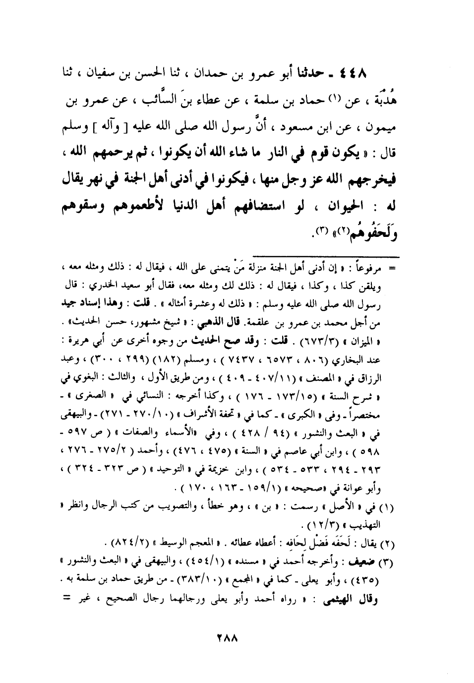 448 - حَدَّثَنَا أَبُو عَمْرِو بْنُ حَمْدَانَ، ثنا الْحَسَنُ بْنُ سُفْيَانَ، ثنا هُدْبَةُ، عَنْ حَمَّادِ بْنِ سَلَمَةَ، عَنْ عَطَاءِ بْنِ السَّائِبِ، عَنْ عَمْرِو بْنِ مَيْمُونٍ , عَنِ ابْنِ مَسْعُودٍ، أَنَّ رَسُولَ اللَّهِ صَلَّى اللَّهُ عَلَيْهِ وَآلِهِ وَسَلَّمَ قَالَ: " §يَكُونُ قَوْمٌ فِي النَّارِ مَا شَاءَ اللَّهُ أَنْ يَكُونُوا، ثُمَّ يَرْحَمُهُمُ اللَّهُ، فَيُخْرِجُهُمُ اللَّهُ عَزَّ وَجَلَّ مِنْهَا، فَيَكُونُوا فِي أَدْنَى أَهْلِ الْجَنَّةِ فِي نَهْرٍ يُقَالُ لَهُ: الْحَيَوَانُ، لَوِ اسْتَضَافَهُمْ أَهْلُ الدُّنْيَا لَأَطْعَمُوهُمْ وَسَقَوْهُمْ وَلَحَفُوهُمْ