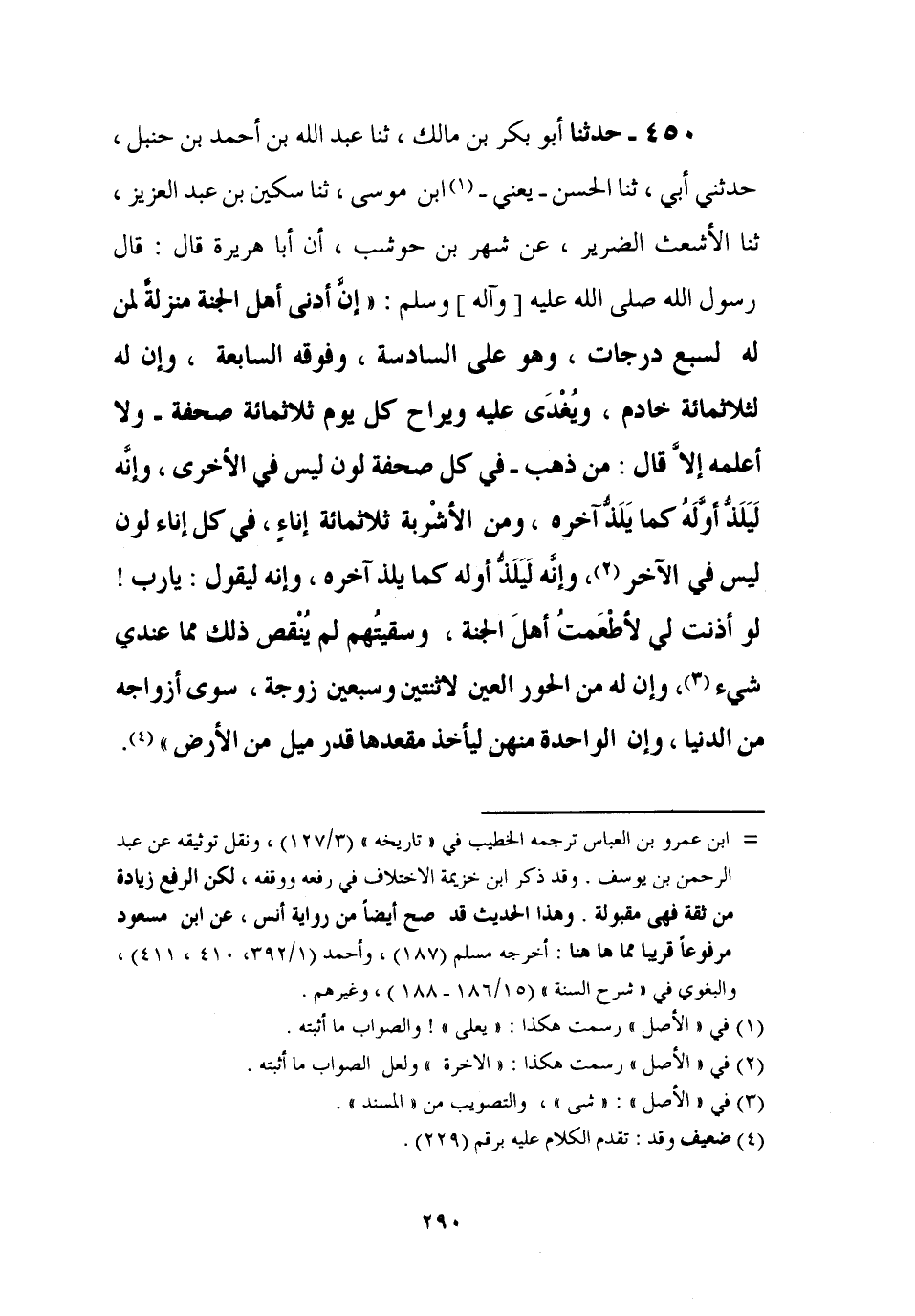450 - حَدَّثَنَا أَبُو بَكْرِ بْنُ مَالِكٍ، ثنا عَبْدُ اللَّهِ بْنُ أَحْمَدَ بْنِ حَنْبَلٍ، حَدَّثَنِي أَبِي، ثنا الْحَسَنُ يَعْنِي ابْنَ مُوسَى، ثنا سِكِّينُ بْنُ عَبْدِ الْعَزِيزِ، ثنا الْأَشْعَثُ الضَّرِيرُ، عَنْ شَهْرِ بْنِ حَوْشَبٍ، أَنَّ أَبَا هُرَيْرَةَ، قَالَ: قَالَ رَسُولُ اللَّهِ صَلَّى اللَّهُ عَلَيْهِ وَآلِهِ وَسَلَّمَ: إِنَّ §أَدْنَى أَهْلِ الْجَنَّةِ مَنْزِلَةً لَمَنْ لَهُ لَسَبْعُ دَرَجَاتٍ، وَهُوَ عَلَى السَّادِسَةِ، وَفَوْقَهُ السَّابِعَةٌ، وَإِنَّ لَهُ لَثَلَاثَمِائَةِ خَادِمٍ، وَيُغْدَى عَلَيْهِ وَيُرَاحُ كُلَّ يَوْمٍ ثَلَاثُمِائَةِ صَحْفَةٍ، وَلَا أَعْلَمُهُ إِلَّا قَالَ: مِنْ ذَهَبٍ فِي كُلِّ صَحْفَةٍ لَوْنٌ لَيْسَ فِي الْأُخْرَى، وَإِنَّهُ لَيَلَذُّ أَوَّلَهُ كَمَا يَلَذُّ آخِرَهُ وَمِنَ الْأَشْرِبَةِ ثَلَاثُمِائَةِ إِنَاءٍ، فِي كُلِّ إِنَاءٍ لَوْنٌ لَيْسَ فِي الْآخَرِ، وَإِنَّهُ لَيَلَذُّ أَوَّلَهُ كَمَا يَلَذُّ آخِرَهُ، وَإِنَّهُ لَيَقُولُ: يَا رَبِّ، لَوْ أَذِنْتَ لِي لَأَطْعَمْتُ أَهْلَ الْجَنَّةِ، وَسَقَيْتُهُمْ لَمْ يَنْقُصْ ذَلِكَ مِمَّا عِنْدِي شَيْءٌ وَإِنَّ لَهُ مِنَ الْحُورِ الْعِينِ لَاثْنَتَيْنِ وَسَبْعِينَ زَوْجَةً، سِوَى أَزْوَاجِهِ مِنَ الدُّنْيَا وَإِنَّ الْوَاحِدَةَ مِنْهُنَّ لَيَأْخُذُ مِقْعَدُهَا قَدْرَ مِيلٍ مِنَ الْأَرْضِ