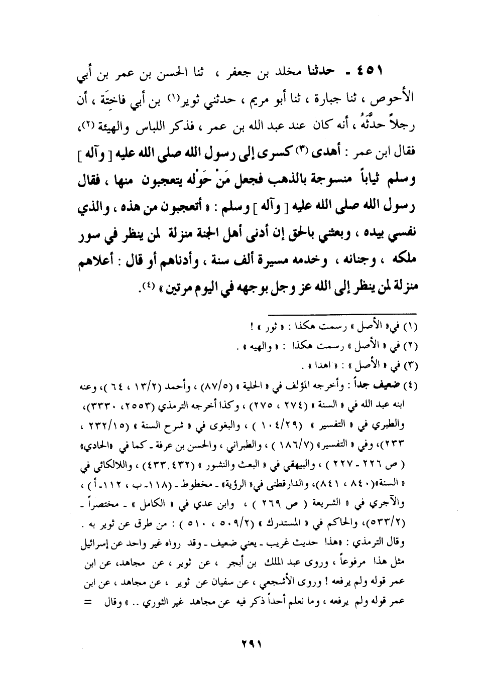 451 - حَدَّثَنَا مَخْلَدُ بْنُ جَعْفَرٍ، ثنا الْحَسَنُ بْنُ عُمَرَ بْنِ أَبِي الْأَحْوَصِ، ثنا جُبَارَةُ، ثنا أَبُو مَرْيَمَ، حَدَّثَنِي ثُوَيْرُ بْنُ أَبِي فَاخِتَةَ، أَنَّ رَجُلًا، حَدَّثَهُ، أَنَّهُ كَانَ عِنْدَ عَبْدِ اللَّهِ بْنِ عُمَرَ، فَذَكَرَ اللِّبَاسَ وَالْهَيْئَةَ، فَقَالَ ابْنُ عُمَرَ: أَهْدَى كِسْرَى إِلَى رَسُولِ اللَّهِ صَلَّى اللَّهُ عَلَيْهِ وَآلِهِ وَسَلَّمَ ثِيَابًا مَنْسُوجَةً بِالذَّهَبِ فَجَعَلَ مَنْ حَوْلَهُ يَتَعَجَّبُونَ مِنْهَا فَقَالَ رَسُولُ اللَّهِ صَلَّى اللَّهُ عَلَيْهِ وَآلِهِ وَسَلَّمَ:، §أَتَعْجَبُونَ مِنْ هَذِهِ وَالَّذِي نَفْسِي بِيَدِهِ، وَبَعَثَنِي بِالْحَقِّ إِنَّ أَدْنَى أَهْلِ الْجَنَّةِ مَنْزِلَةً، لِمَنْ يَنْظُرُ فِي سُورِ مُلْكِهِ وَجِنَانِهِ، وَخَدَمِهِ مَسِيرَةَ أَلْفِ سَنَةٍ، وَأَدْنَاهُمْ أَوْ قَالَ: أَعْلَاهُمْ مَنْزِلَةً لَمَنْ يَنْظُرُ إِلَى اللَّهِ عَزَّ وَجَلَّ بِوَجْهِهِ فِي الْيَوْمِ مَرَّتَيْنِ