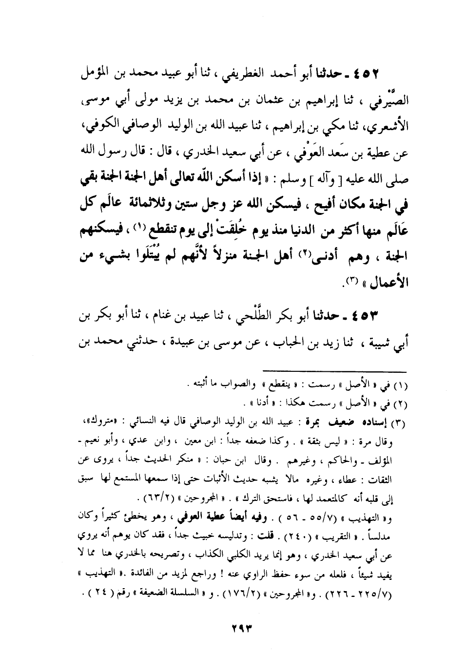 452 - حَدَّثَنَا أَبُو أَحْمَدَ الْغِطْرِيفِيُّ، ثنا أَبُو عُبَيْدٍ مُحَمَّدُ بْنُ الْمُؤَمَّلِ الصَّيْرَفِيُّ، ثنا إِبْرَاهِيمُ بْنُ عُثْمَانَ بْنِ مُحَمَّدِ بْنِ يَزِيدَ مَوْلَى أَبِي مُوسَى الْأَشْعَرِيِّ، ثنا مَكِّيُّ بْنُ إِبْرَاهِيمَ، ثنا عُبَيْدُ اللَّهِ بْنُ الْوَلِيدِ الْوَصَّافِيُّ الْكُوفِيُّ، عَنْ عَطِيَّةَ بْنِ سَعْدٍ الْعَوْفِيِّ , عَنْ أَبِي سَعِيدٍ الْخُدْرِيِّ، قَالَ: قَالَ رَسُولُ اللَّهِ صَلَّى اللَّهُ عَلَيْهِ وَآلِهِ وَسَلَّمَ: §، إِذَا أَسْكَنَ اللَّهُ تَعَالَى أَهْلَ الْجَنَّةِ الْجَنَّةَ بَقِيَ فِي الْجَنَّةِ مَكَانٌ أَفْيَحُ، فَيُسْكِنُ اللَّهُ عَزَّ وَجَلَّ سِتِّينَ وَثَلَاثَمِائَةِ عَالَمٍ كُلُّ عَالَمٍ مِنْهَا أَكْثَرُ مِنَ الدُّنْيَا مُنْذُ يَوْمِ خُلِقَتْ إِلَى يَوْمِ تَنْقَطِعُ فَيُسْكِنُهُمُ الْجَنَّةَ، وَهُمْ أَدْنَى أَهْلِ الْجَنَّةِ مَنْزِلًا لِأَنَّهُمْ لَمْ يُبْتَلَوْا بِشَيْءٍ مِنَ الْأَعْمَالِ