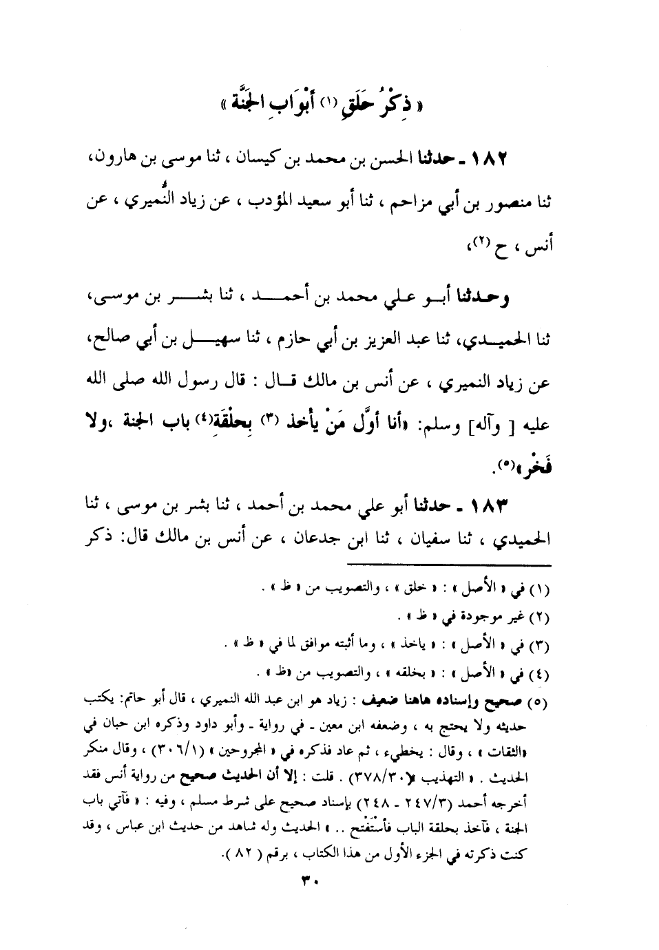 182 - حَدَّثَنَا الْحَسَنُ بْنُ مُحَمَّدِ بْنِ كَيْسَانَ، ثنا مُوسَى بْنُ هَارُونَ، ثنا مَنْصُورُ بْنُ أَبِي مُزَاحِمٍ، ثنا أَبُو سَعِيدٍ الْمُؤَدِّبُ، عَنْ زِيَادٍ النُّمَيْرِيِّ، عَنْ أَنَسٍ، ح. وَحَدَّثَنَا أَبُو عَلِيٍّ مُحَمَّدُ بْنُ أَحْمَدَ، ثنا بِشْرُ بْنُ مُوسَى، ثنا الْحُمَيْدِيُّ، ثنا عَبْدُ الْعَزِيزِ بْنُ أَبِي حَازِمٍ، ثنا سُهَيْلُ بْنُ أَبِي صَالِحٍ، عَنْ زِيَادٍ النُّمَيْرِيِّ , عَنْ أَنَسِ بْنِ مَالِكٍ، قَالَ: قَالَ رَسُولُ اللَّهِ صَلَّى اللَّهُ عَلَيْهِ وَآلِهِ وَسَلَّمَ:، §أَنَا أَوَّلُ مَنْ يَأْخُذُ بِحَلْقَةِ بَابِ الْجَنَّةِ، وَلَا فَخْرَ