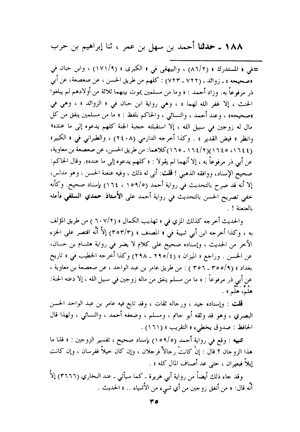 188 - حَدَّثَنَا أَحْمَدُ بْنُ سَهْلِ بْنِ عُمَرَ، ثنا إِبْرَاهِيمُ بْنُ حَرْبٍ -[36]- الْعَسْكَرِيُّ، ثنا عَبْدُ الْأَعْلَى بْنُ حَمَّادٍ، ثنا يَزِيدُ بْنُ زُرَيْعٍ، ثنا مُحَمَّدُ بْنُ عَمْرٍو، ثنا أَبُو سَلَمَةَ، عَنْ أَبِي هُرَيْرَةَ، ح، وَحَدَّثَنَا فَارُوقٌ الْخَطَّابِيُّ، ثنا أَبُو مُسْلِمٍ الْكَشِّيُّ، ثنا حَجَّاجٌ، ثنا حَمَّادٌ، عَنْ مُحَمَّدِ بْنِ عَمْرٍو، عَنْ أَبِي سَلَمَةَ , عَنْ أَبِي هُرَيْرَةَ، قَالَ: قَالَ رَسُولُ اللَّهِ صَلَّى اللَّهُ عَلَيْهِ وَآلِهِ وَسَلَّمَ: §، مَنْ أَنْفَقَ زَوْجَيْنِ مِنْ مَالِهِ فِي سَبِيلِ اللَّهِ عَزَّ وَجَلَّ، دَعَتْهُ حَجَبَةُ الْجَنَّةِ، يَقُولُونَ: أَيْ فُلَ، أَيْ فُلَ، هَلُمَّ هَذَا خَيْرٌ، قَالَ أَبُو بَكْرٍ: يَا رَسُولَ اللَّهِ، هَذَا الَّذِي لَا تَوًى عَلَيْهِ. قَالَ: أَمَا إِنِّي أَرْجُو أَنْ تَدْعُوَكَ حَجَبَةُ الْجَنَّةِ كُلُّهَا، قَالَ يَزِيدُ بْنُ زُرَيْعٍ: خَزَنَةُ الْجَنَّةِ