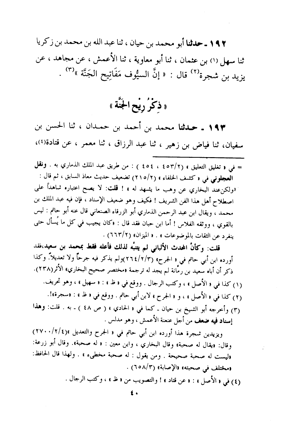 192 - حَدَّثَنَا أَبُو مُحَمَّدِ بْنُ حَيَّانَ، ثنا عَبْدُ اللَّهِ بْنُ مُحَمَّدِ بْنِ زَكَرِيَّا، ثنا سَهْلُ بْنُ عُثْمَانَ، ثنا أَبُو مُعَاوِيَةَ، ثنا الْأَعْمَشُ، عَنْ مُجَاهِدٍ , عَنْ يَزِيدَ بْنِ شَجَرَةَ، قَالَ: إِنَّ §السُّيُوفَ مَفَاتِيحُ الْجَنَّةِ