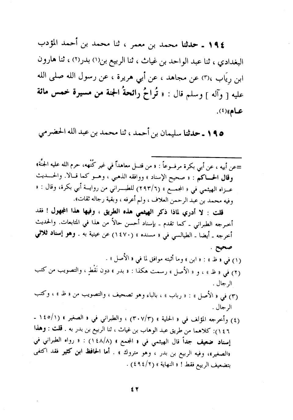 194 - حَدَّثَنَا مُحَمَّدُ بْنُ مَعْمَرٍ، ثنا مُحَمَّدُ بْنُ أَحْمَدَ الْمُؤَدِّبُ الْبَغْدَادِيُّ، ثنا عَبْدُ الْوَاحِدِ بْنُ غِيَاثٍ، ثنا الرَّبِيعُ بْنُ بَدْرٍ، ثنا هَارُونُ بْنُ رِيَابٍ، عَنْ مُجَاهِدٍ , عَنْ أَبِي هُرَيْرَةَ، عَنْ رَسُولِ اللَّهِ صَلَّى اللَّهُ عَلَيْهِ وَآلِهِ وَسَلَّمَ قَالَ: §" تُرَاحُ رَائِحَةُ الْجَنَّةِ مِنْ مَسِيرَةِ خَمْسِ مِائَةِ عَامٍ