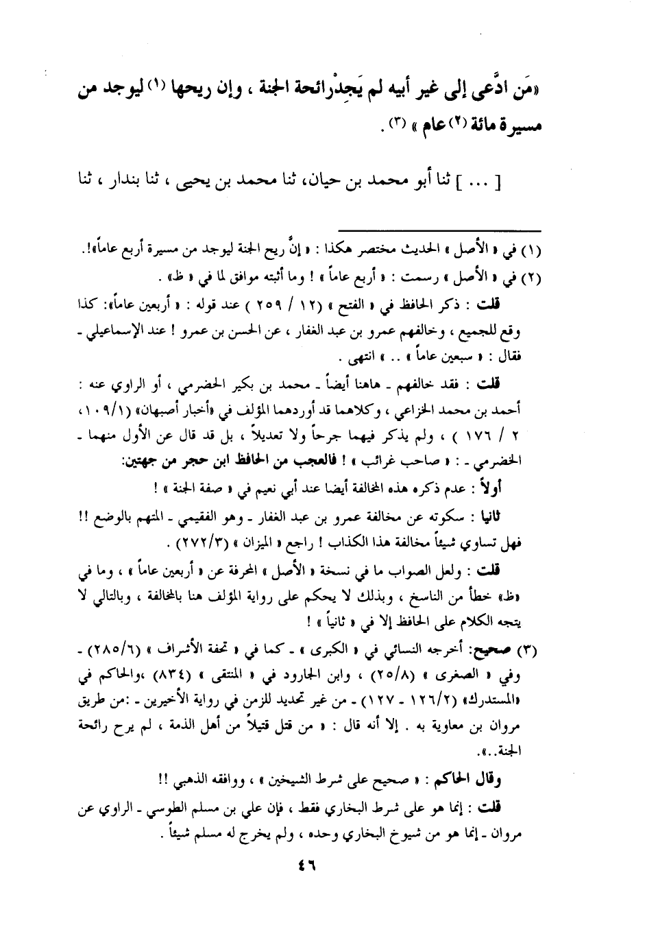 ( ... ) - ثنا أَبُو مُحَمَّدِ بْنُ حَيَّانَ، ثنا مُحَمَّدُ بْنُ يَحْيَى، ثنا بُنْدَارٌ، ثنا -[47]- مُؤَمَّلٌ، ثنا سُفْيَانُ، عَنِ الْأَعْمَشِ، عَنْ مُجَاهِدٍ، عَنْ جُنَادَةَ بْنِ أَبِي أُمَيَّةَ , عَنْ عَبْدِ اللَّهِ بْنِ عَمْرٍو، قَالَ: " §مَنِ ادَّعَى إِلَى غَيْرِ أَبِيهِ لَمْ يَجِدْ رَائِحَةَ الْجَنَّةِ، وَإِنَّ رِيحَهَا لَيُوجَدُ مِنْ مَسِيرَةِ مِائَةِ عَامٍ