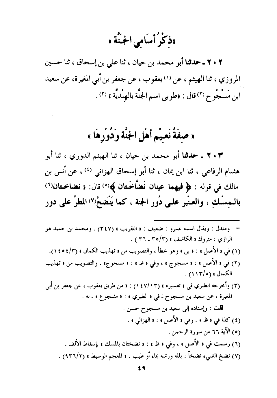 202 - حَدَّثَنَا أَبُو مُحَمَّدِ بْنُ حَيَّانَ، ثنا عَلِيُّ بْنُ إِسْحَاقَ، ثنا حُسَيْنُ الْمَرْوَزِيُّ، ثنا الْهَيْثَمُ، عَنْ يَعْقُوبَ، عَنْ جَعْفَرِ بْنِ أَبِي الْمُغِيرَةِ , عَنْ سَعِيدِ بْنِ مَسْجُوحٍ، قَالَ: §" طُوبَى اسْمُ الْجَنَّةِ بِالْهِنْدِيَّةِ