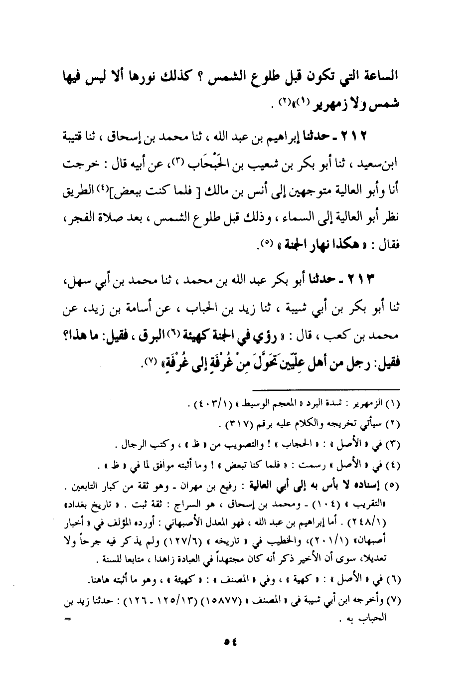 212 - حَدَّثَنَا إِبْرَاهِيمُ بْنُ عَبْدِ اللَّهِ، ثنا مُحَمَّدُ بْنُ إِسْحَاقَ، ثنا قُتَيْبَةُ بْنُ سَعِيدٍ، ثنا أَبُو بَكْرِ بْنُ شُعَيْبِ بْنِ الْحَبْحَابِ، عَنْ أَبِيهِ، قَالَ:، خَرَجْتُ أَنَا وَأَبُو الْعَالِيَةِ، مُتَوَجِّهَيْنِ إِلَى أَنَسِ بْنِ مَالِكٍ فَلَمَّا §كُنْتُ بِبَعْضِ الطَّرِيقِ نَظَرَ أَبُو الْعَالِيَةِ إِلَى السَّمَاءِ، وَذَلِكَ قَبْلَ طُلُوعِ الشَّمْسِ، وَبَعْدَ صَلَاةِ الْفَجْرِ، فَقَالَ: هَكَذَا نَهَارُ الْجَنَّةِ