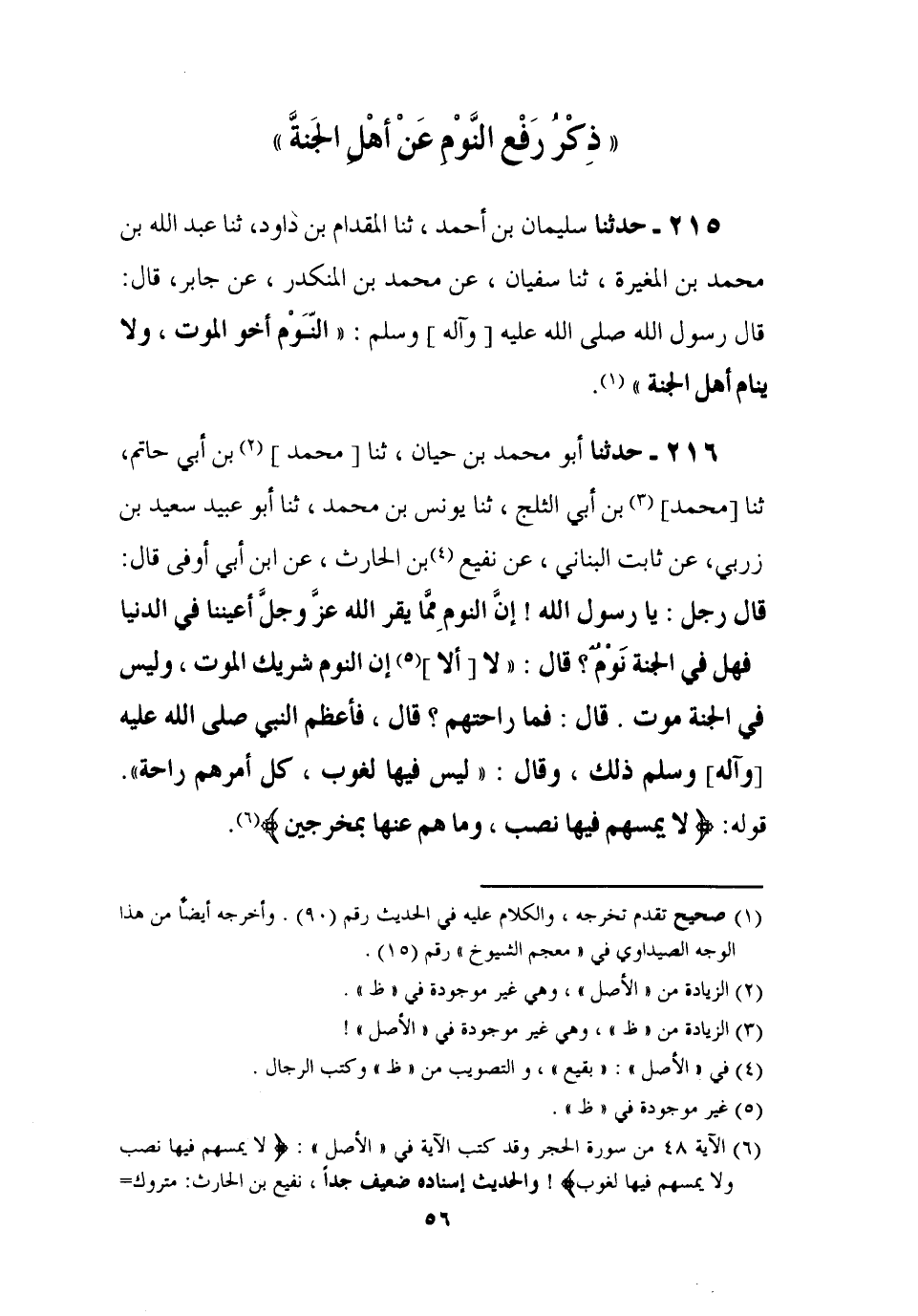 216 - حَدَّثَنَا أَبُو مُحَمَّدِ بْنُ حَيَّانَ، ثنا مُحَمَّدُ بْنُ أَبِي حَاتِمٍ، ثنا مُحَمَّدُ بْنُ أَبِي الثَّلْجِ، ثنا يُونُسُ بْنُ مُحَمَّدٍ، ثنا أَبُو عُبَيْدَةَ سَعِيدُ بْنُ زَرْبِيِّ، عَنْ ثَابِتٍ الْبُنَانِيِّ، عَنْ نُفَيْعِ بْنِ الْحَارِثِ , عَنِ ابْنِ أَبِي أَوْفَى، قَالَ: قَالَ رَجُلٌ: يَا رَسُولَ اللَّهِ، إِنَّ النَّوْمَ مِمَّا يُقِرُّ اللَّهُ عَزَّ وَجَلَّ أَعْيُنَنَا فِي الدُّنْيَا، فَهَلْ فِي الْجَنَّةِ نَوْمٌ؟ قَالَ: لَا، أَلَا إِنَّ §النَّوْمَ شَرِيكُ الْمَوْتِ، وَلَيْسَ فِي الْجَنَّةِ مَوْتٌ، قَالَ: فَمَا رَاحَتْهُمْ؟ قَالَ: فَأَعْظَمَ النَّبِيُّ صَلَّى اللَّهُ عَلَيْهِ وَآلِهِ وَسَلَّمَ ذَلِكَ وَقَالَ: لَيْسَ فِيهَا لُغُوبٌ، كُلُّ أَمْرِهِمْ رَاحَةٌ، قَوْلُهُ: {لَا يَمَسُّهُمْ فِيهَا نَصَبٌ وَمَا هُمْ مِنْهَا بِمُخْرَجِينَ} [الحجر: 48]