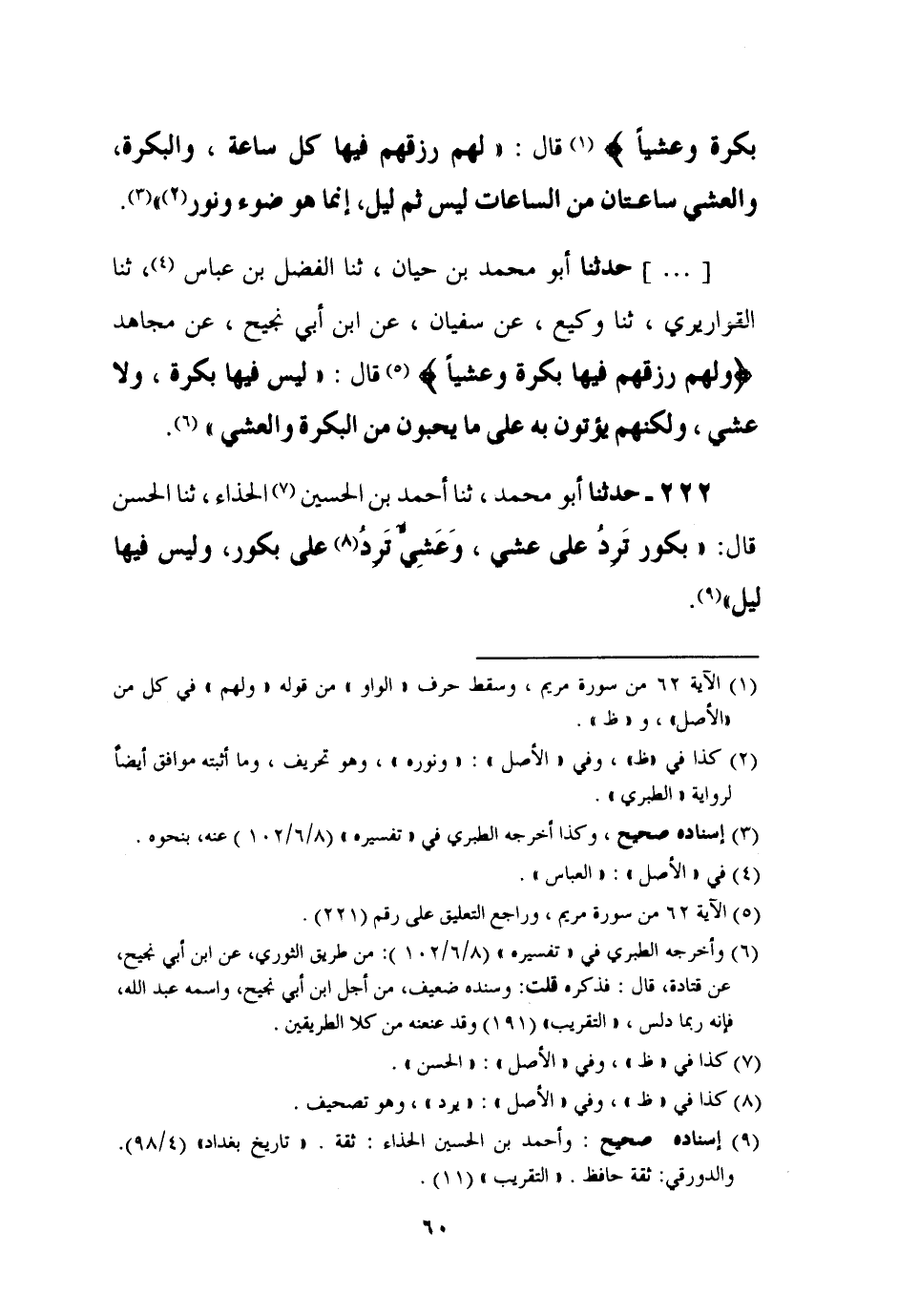 ( ... ) - حَدَّثَنَا أَبُو مُحَمَّدِ بْنُ حَيَّانَ، ثنا الْفَضْلُ بْنُ عَبَّاسٍ، ثنا الْقَوَارِيرِيُّ، ثنا وَكِيعٌ، عَنْ سُفْيَانَ، عَنِ ابْنِ أَبِي نَجِيحٍ , عَنْ مُجَاهِدٍ، {وَلَهُمْ رِزْقُهُمْ فِيهَا بُكْرَةً وَعَشِيًّا} [مريم: 62] قَالَ: " §لَيْسَ فِيهَا بُكْرَةٌ وَلَا عَشِيُّ، وَلَكِنَّهُمْ يُؤْتَوْنَ بِهِ عَلَى مَا يُحِبُّونَ مِنَ الْبُكْرَةِ وَالْعَشِيِّ