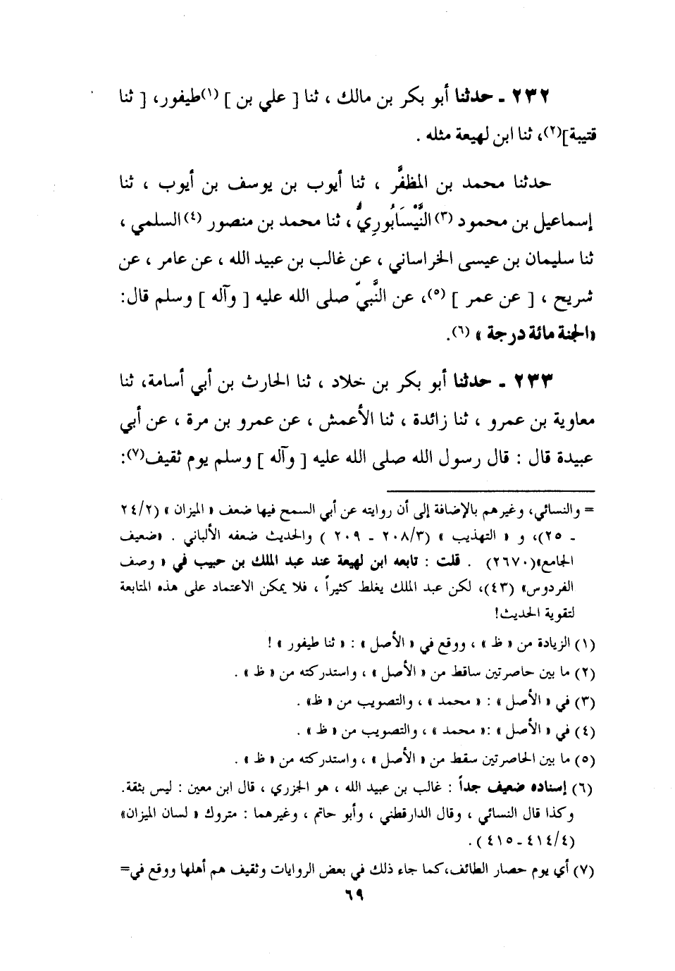 حَدَّثَنَا مُحَمَّدُ بْنُ الْمُظَفَّرِ، ثنا أَيُّوبُ بْنُ يُوسُفَ بْنِ أَيُّوبَ، ثنا إِسْمَاعِيلُ بْنُ مَحْمُودٍ النَّيْسَابُورِيُّ، ثنا مُحَمَّدُ بْنُ مَنْصُورٍ السُّلَمِيُّ، ثنا سُلَيْمَانُ بْنُ عِيسَى الْخُرَاسَانِيُّ، عَنْ غَالِبِ بْنِ عُبَيْدِ اللَّهِ، عَنْ عَامِرٍ، عَنْ شُرَيْحٍ , عَنْ عُمَرَ، عَنِ النَّبِيِّ صَلَّى اللَّهُ عَلَيْهِ وَآلِهِ وَسَلَّمَ قَالَ: §" الْجَنَّةُ مِائَةُ دَرَجَةٍ