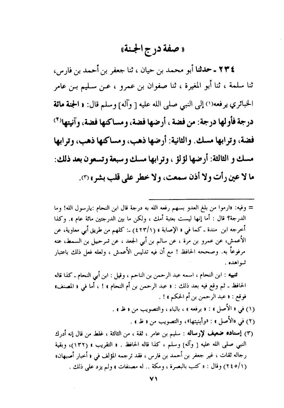 234 - حَدَّثَنَا أَبُو مُحَمَّدِ بْنُ حَيَّانَ، ثنا جَعْفَرُ بْنُ أَحْمَدَ بْنِ فَارِسٍ، ثنا سَلَمَةُ، ثنا أَبُو الْمُغِيرَةِ، ثنا صَفْوَانُ بْنُ عَمْرٍو , عَنْ سُلَيْمِ بْنِ عَامِرٍ الْخَبَائِرِيِّ، يَرْفَعْهُ إِلَى النَّبِيِّ صَلَّى اللَّهُ عَلَيْهِ وَآلِهِ وَسَلَّمَ قَالَ: " §الْجَنَّةُ مِائَةُ دَرَجَةٍ فَأَوَّلُهَا دَرَجَةٌ مِنْ فِضَّةٍ أَرْضُهَا فِضَّةٌ، وَمَسَاكِنُهَا فِضَّةٌ، وَآنِيَتُهَا فِضَّةٌ، وَتُرَابُهَا مِسْكٌ، وَالثَّانِيَةُ أَرْضُهَا ذَهَبٌ، وَمَسَاكِنُهَا ذَهَبٌ وَتُرَابُهَا مِسْكٌ، وَالثَّالِثَةُ أَرْضُهَا لُؤْلُؤٌ وَتُرَابُهَا مِسْكٌ وَسَبْعَةُ وَتِسْعُونَ بَعْدَ ذَلِكَ مَا لَا عَيْنٌ رَأَتْ وَلَا أُذُنٌ سَمِعَتْ وَلَا خَطَرَ عَلَى قَلْبِ بَشَرٍ