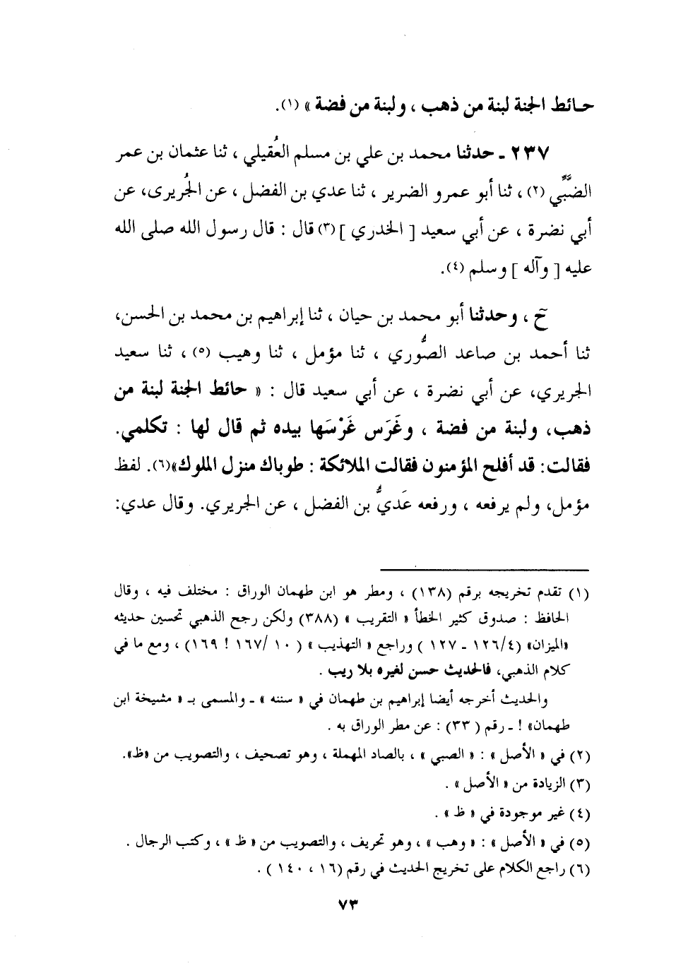 237 - حَدَّثَنَا مُحَمَّدُ بْنُ عَلِيِّ بْنِ مُسْلِمٍ الْعُقَيْلِيُّ، ثنا عُثْمَانُ بْنُ عُمَرَ الضَّبِّيُّ، ثنا أَبُو عَمْرٍو الضَّرِيرُ، ثنا عَدِيُّ بْنُ الْفَضْلِ، عَنِ الْجُرَيْرِيِّ، عَنْ أَبِي نَضْرَةَ، عَنْ أَبِي سَعِيدٍ الْخُدْرِيِّ، قَالَ: قَالَ رَسُولُ اللَّهِ صَلَّى اللَّهُ عَلَيْهِ وَآلِهِ وَسَلَّمَ. ح، وَحَدَّثنا أَبُو مُحَمَّدِ بْنُ حَيَّانَ، ثنا إِبْرَاهِيمُ بْنُ مُحَمَّدِ بْنِ الْحَسَنِ، ثنا أَحْمَدُ بْنُ صَاعِدٍ الصُّورِيُّ، ثنا مُؤَمَّلٌ، ثنا وُهَيْبٌ، ثنا سَعِيدٌ الْجُرَيْرِيُّ، عَنْ أَبِي نَضْرَةَ , عَنْ أَبِي سَعِيدٍ قَالَ: §حَائِطُ الْجَنَّةِ لَبِنَةٌ مِنْ ذَهَبٍ، وَلَبِنَةٌ مِنْ فِضَّةٍ، وَغَرَسَ غَرْسَهَا بِيَدِهِ ثُمَّ قَالَ لَهَا: تَكَلَّمِي فَقَالَتْ: {قَدْ أَفْلَحَ الْمُؤْمِنُونَ} [المؤمنون: 1] . فَقَالَتِ الْمَلَائِكَةُ: طُوبَاكِ مَنْزِلَ الْمُلُوكِ لَفْظُ مُؤَمَّلٍ، وَلَمْ يَرْفَعْهُ، وَرَفَعَهُ عَدِيُّ بْنُ الْفَضْلِ، عَنِ الْجُرَيْرِيِّ، وَقَالَ عَدِيُّ: -[74]- خَلَقَهَا بِيَدِهِ، وَلَمْ يَقُلْ: غَرَسَ غَرْسَهَا