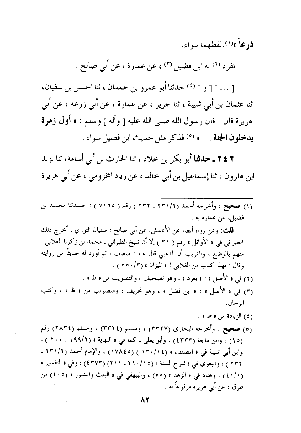 242 - حَدَّثَنَا أَبُو بَكْرِ بْنُ خَلَّادٍ، ثنا الْحَارِثُ بْنُ أَبِي أُسَامَةَ، ثنا يَزِيدُ بْنُ هَارُونَ، ثنا إِسْمَاعِيلُ بْنُ أَبِي خَالِدٍ، عَنْ زِيَادٍ الْمَخْزُومِيِّ , عَنْ أَبِي هُرَيْرَةَ، -[83]- قَالَ: قَالَ رَسُولُ اللَّهِ صَلَّى اللَّهُ عَلَيْهِ وَآلِهِ وَسَلَّمَ:، §أَوَّلُ زُمْرَةٍ تَدْخُلُ الْجَنَّةِ مِنْ أُمَّتِي: سَبْعُونَ أَلْفًا لَيْسَ عَلَيْهِمْ حِسَابٌ، وَلَا عَذَابٌ، صُورَةُ وَجْهِ كُلِّ رَجُلٍ مِنْهُمْ عَلَى ضَوْءِ الْقَمَرِ لَيْلَةَ الْبَدْرِ، وَالَّذِينَ يَلُونَهُمْ عَلَى أَضْوَاءِ كَوْكَبٍ دُرِّيٍّ فِي السَّمَاءِ، ثُمَّ هُمْ بَعْدَ ذَلِكَ مَنَازِلُ، رَوَاهُ ابْنُ الْمُبَارَكِ، عَنْ إِسْمَاعِيلَ،
