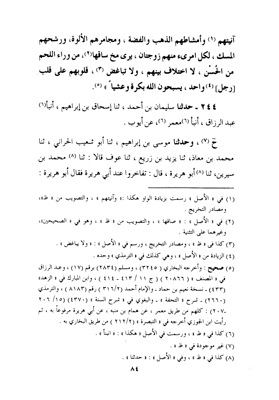 244 - حَدَّثَنَا سُلَيْمَانُ بْنُ أَحْمَدَ، ثنا إِسْحَاقُ بْنُ إِبْرَاهِيمَ، أَنْبَأَ عَبْدُ الرَّزَّاقِ، أَنْبَأَ مَعْمَرٌ، عَنْ أَيُّوبَ، ح، وَحَدَّثَنَا مُوسَى بْنُ إِبْرَاهِيمَ، ثنا أَبُو شُعَيْبٍ الْحَرَّانِيُّ، ثنا مُحَمَّدُ بْنُ مُعَاذٍ، ثنا يَزِيدُ بْنُ زُرَيْعٍ، ثنا عَوْفٌ، قَالَا: ثنا مُحَمَّدُ بْنُ سِيرِينَ، ثنا أَبُو هُرَيْرَةَ، قَالَ: تَفَاخَرُوا عِنْدَ أَبِي هُرَيْرَةَ فَقَالَ أَبُو هُرَيْرَةَ: -[85]- سَمِعْتُ رَسُولَ اللَّهِ صَلَّى اللَّهُ عَلَيْهِ وَآلِهِ وَسَلَّمَ يَقُولُ: إِنَّ §أَوَّلُ زُمْرَةٍ تَدْخُلُ الْجَنَّةَ وُجُوهُهُمْ عَلَى صُورَةِ الْقَمَرِ لَيْلَةَ الْبَدْرِ، وَالَّذِينَ يَلُونَهُمْ عَلَى صُورَةِ الْكَوْكَبِ الدُّرِّيِّ فِي السَّمَاءِ، لِكُلِّ رَجُلٍ مِنْهُمْ زَوْجَتَانِ يَرَى مُخَّ سُوقِهِمَا مِنْ وَرَاءِ اللَّحْمِ مِنَ الْحُسْنِ، وَاللَّهِ مَا مِنْهُمْ أَعْزُبُ لَفْظُ عَوْفٍ وَأَيُّوبَ مِثْلُهُ
