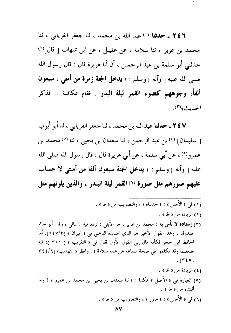 247 - حَدَّثَنَا عَبْدُ اللَّهِ بْنُ مُحَمَّدٍ، ثنا جَعْفَرٌ الْفِرْيَابِيُّ، ثنا أَبُو أَيُّوبَ سُلَيْمَانُ بْنُ عَبْدِ الرَّحْمَنِ، ثنا سَعْدَانُ بْنُ يَحْيَى، ثنا مُحَمَّدُ بْنُ عَمْرٍو، عَنْ أَبِي سَلَمَةَ , عَنْ أَبِي هُرَيْرَةَ، قَالَ: قَالَ رَسُولُ اللَّهِ صَلَّى اللَّهُ عَلَيْهِ وَآلِهِ وَسَلَّمَ: §، يَدْخُلُ الْجَنَّةَ سَبْعُونَ أَلْفًا مِنْ أُمَّتِي لَا حِسَابَ عَلَيْهِمْ صُوَرُهُمْ مِثْلُ صُورَةِ الْقَمَرِ لَيْلَةَ الْبَدْرِ، وَالَّذِينَ يَلُونَهُمْ مِثْلُ -[88]- الْكَوْكَبِ الدُّرِّيِّ فِي أُفُقِ السَّمَاءِ فَقَامَ عُكَّاشَةُ بْنُ مِحْصَنٍ. وَذَكَرَ الْحَدِيثَ