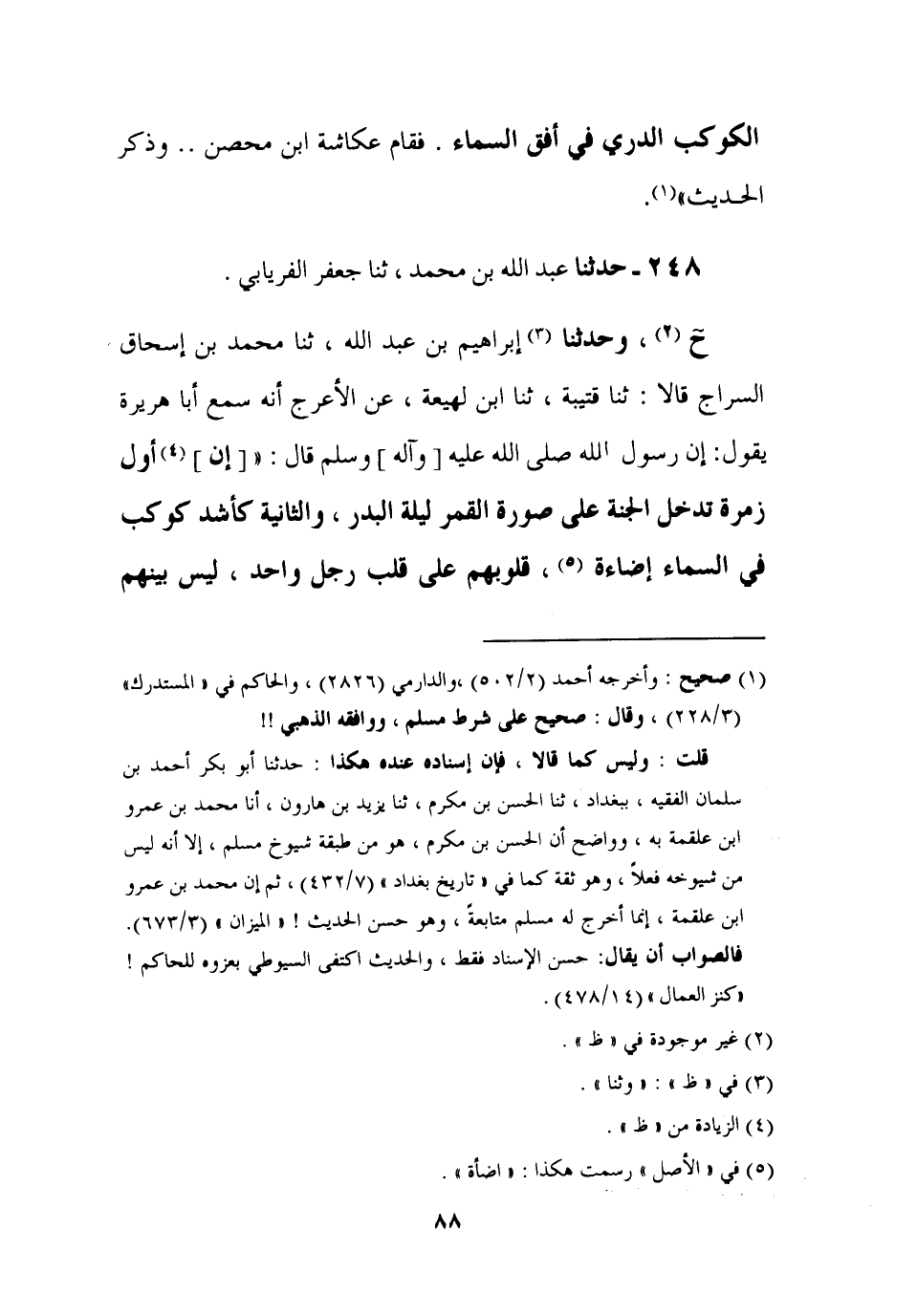 248 - حَدَّثَنَا عَبْدُ اللَّهِ بْنُ مُحَمَّدٍ، ثنا جَعْفَرٌ الْفِرْيَابِيُّ، ح، وَحَدَّثَنَا إِبْرَاهِيمُ بْنُ عَبْدِ اللَّهِ، ثنا مُحَمَّدُ بْنُ إِسْحَاقَ السَّرَّاجُ، قَالَا: ثنا قُتَيْبَةُ، ثنا ابْنُ لَهِيعَةَ، عَنِ الْأَعْرَجِ، أَنَّهُ سَمِعَ أَبَا هُرَيْرَةَ، يَقُولُ: إِنَّ رَسُولَ اللَّهِ صَلَّى اللَّهُ عَلَيْهِ وَآلِهِ وَسَلَّمَ قَالَ: إِنَّ §أَوَّلَ زُمْرَةٍ تَدْخُلُ الْجَنَّةَ عَلَى صُورَةِ الْقَمَرِ لَيْلَةَ الْبَدْرِ، وَالثَّانِيَةُ كَأَشَدِّ كَوْكَبٍ فِي السَّمَاءِ إِضَاءَةً، قُلُوبُهُمْ عَلَى قَلْبِ رَجُلٍ وَاحِدٍ، لَيْسَ بَيْنَهُمْ -[89]- حَسَدٌ وَلَا تَبَاغُضٌ , وَلِكُلِّ رَجُلٍ مِنْهُمْ زَوْجَتَانِ يَرَى مُخَّ سَاقِهِمَا مِنْ وَرَاءِ لُحُومِهِمَا مِنْ حُسْنِهِمَا